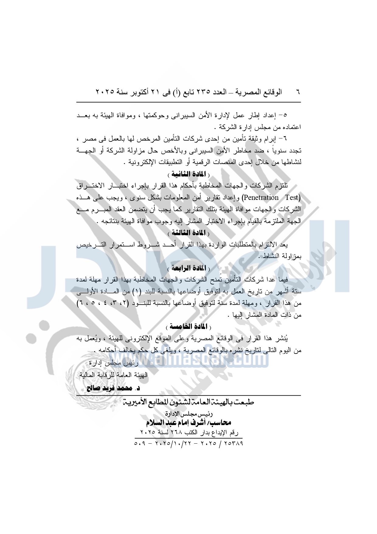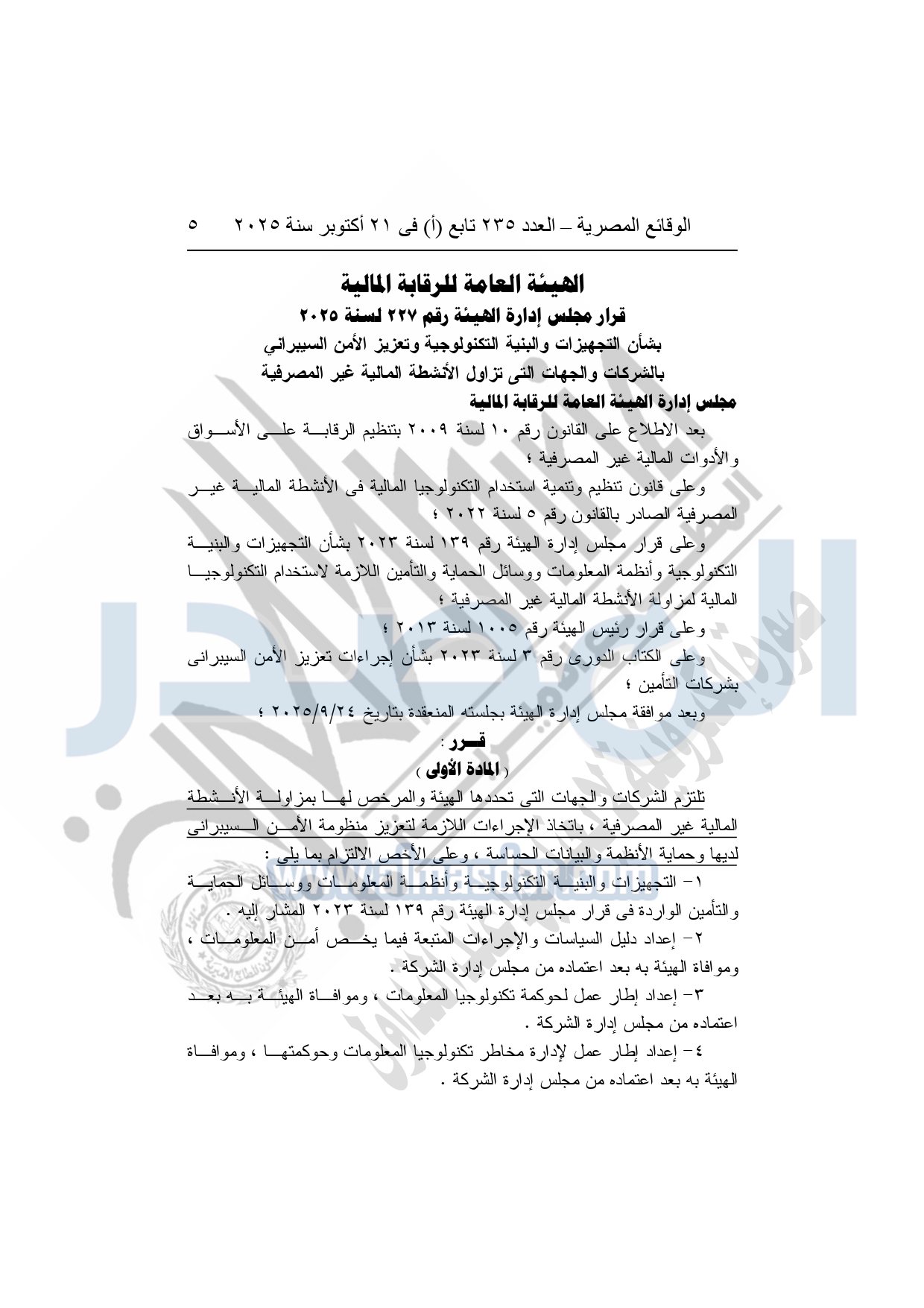 نشرت الوقائع المصرية في العدد 235 تابع "أ"، بتاريخ 21 أكتوبر 2025، قرار الهيئة العامة للرقابة المالية، رقم 227 لسنة 2025، بشأن التجهيزات والبنية التكنولوجية وتعزيز الأمن السيبراني بالشركات والجهات التى تزاول الأنشطة المالية غير المصرفية.
