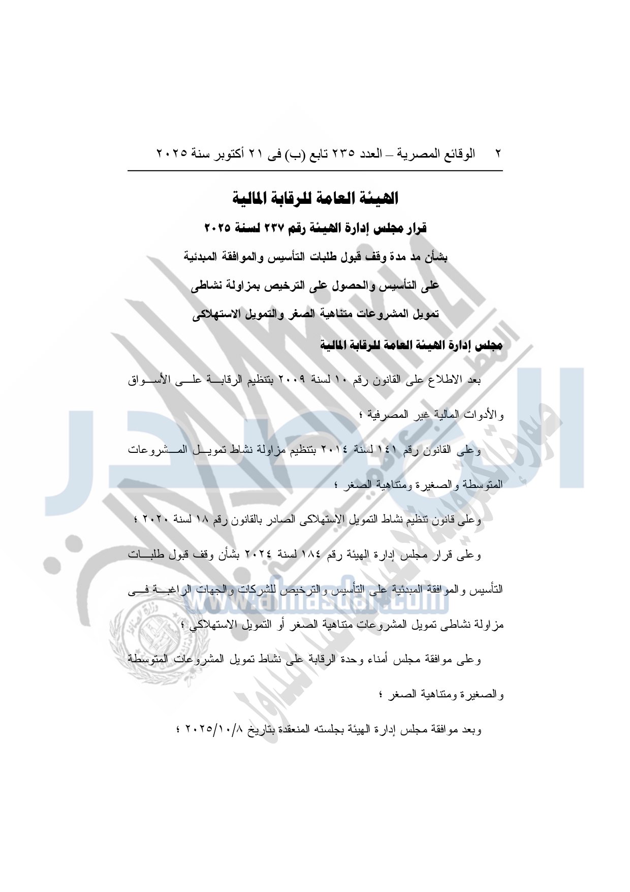 نشرت الوقائع المصرية في العدد 235 تابع "ب"، بتاريخ 21 أكتوبر 2025، قرار الهيئة العامة للرقابة المالية، رقم 237 لسنة 2025، بشأن مد مدة وقف قبول طلبات التأسيس والموافقة المبدئية على التأسيس والحصول على الترخيص بمزاولة نشاطي تمويل المشروعات متناهية الصغر والتمويل الاستهلاكي.