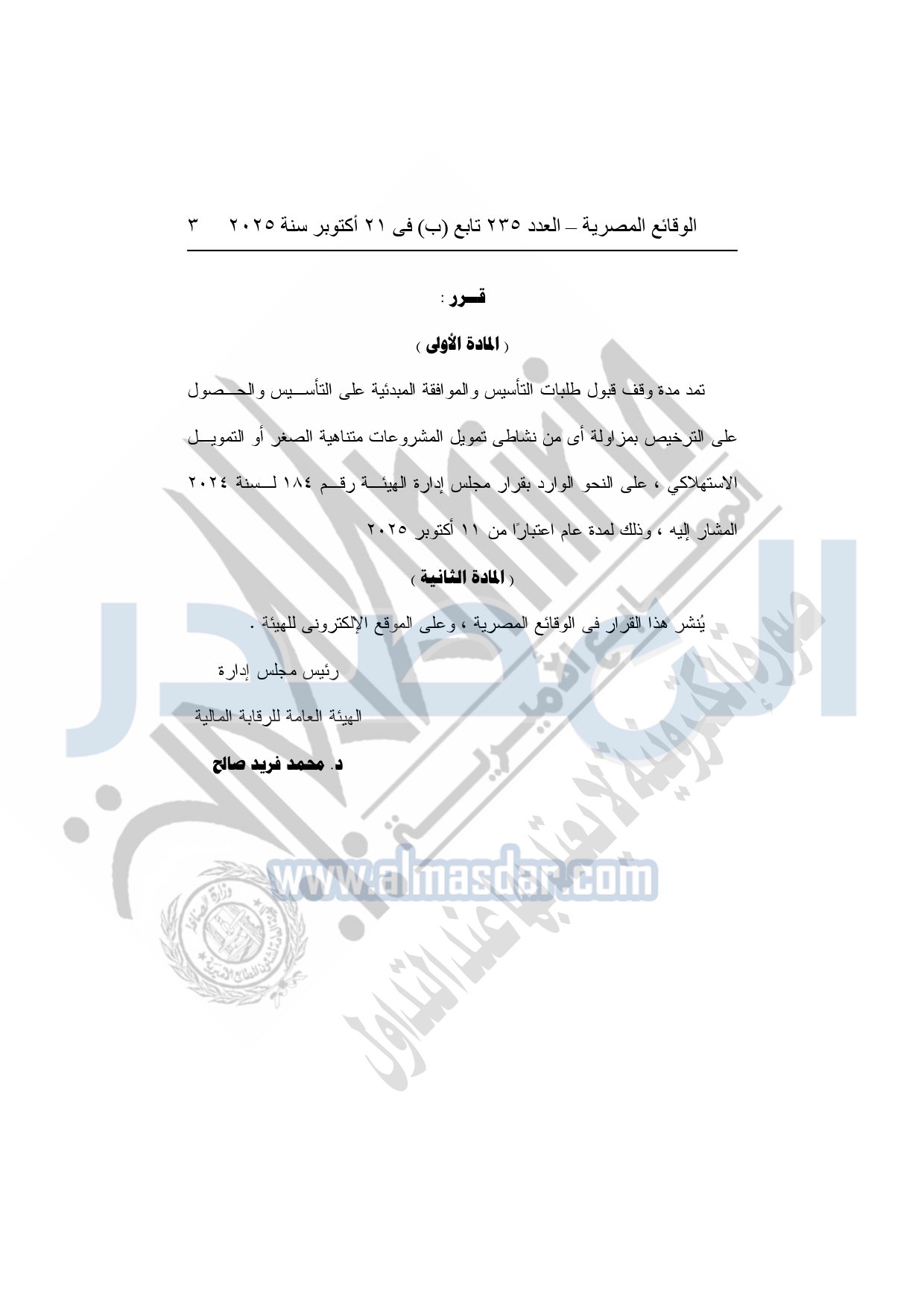 تمد مدة وقف قبول طلبات التأسيس والموافقة المبدئية على التأسيس والحصول على الترخيص بمزاولة أى من نشاطى تمويل المشروعات متناهية الصغر أو التمويل الاستهلاكي، على النحو الوارد بقرار مجلس إدارة الهيئة رقم 184 لسنة 2024 المشار إليه، وذلك لمدة عام اعتبارًا من 11 أكتوبر 2025.