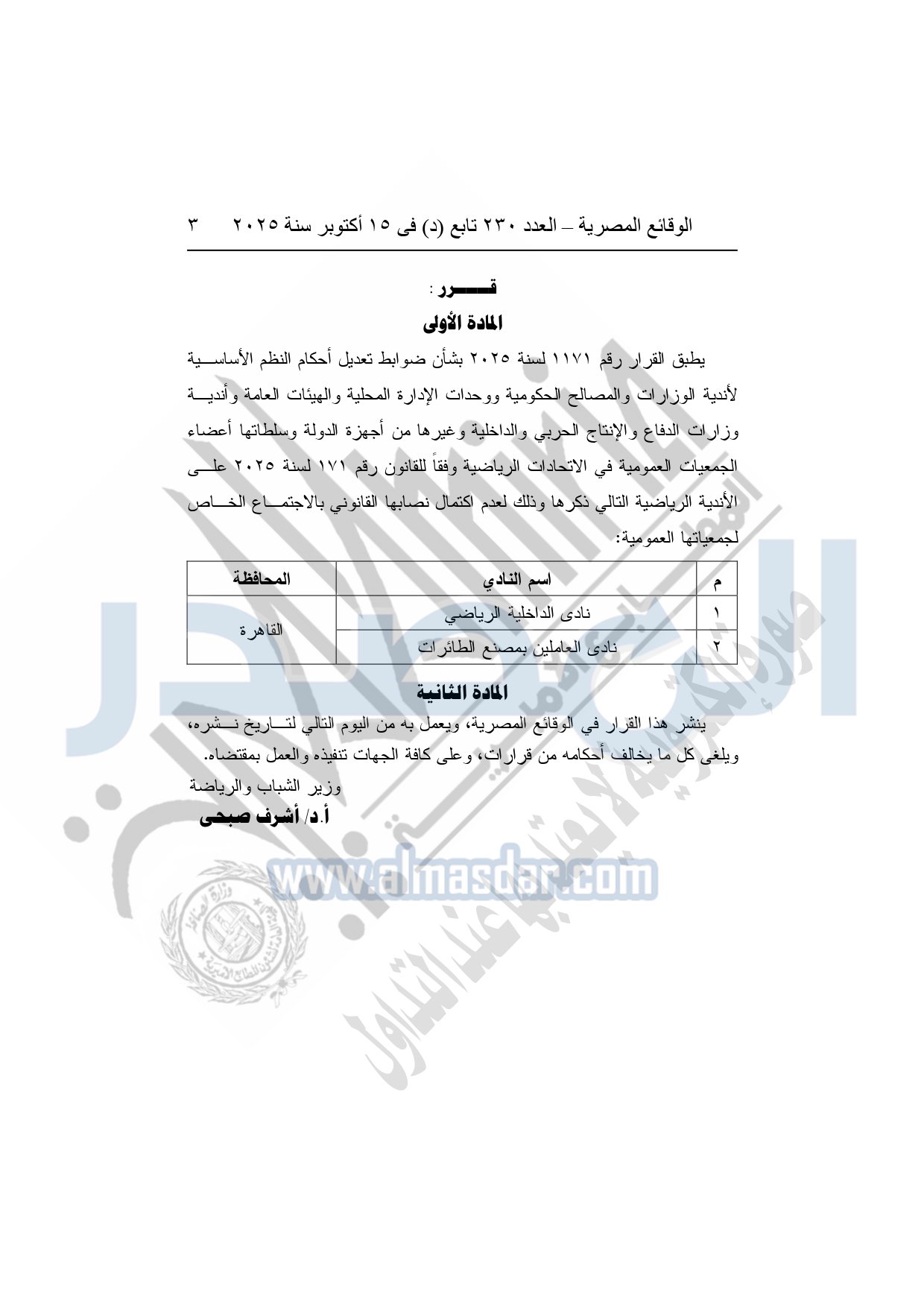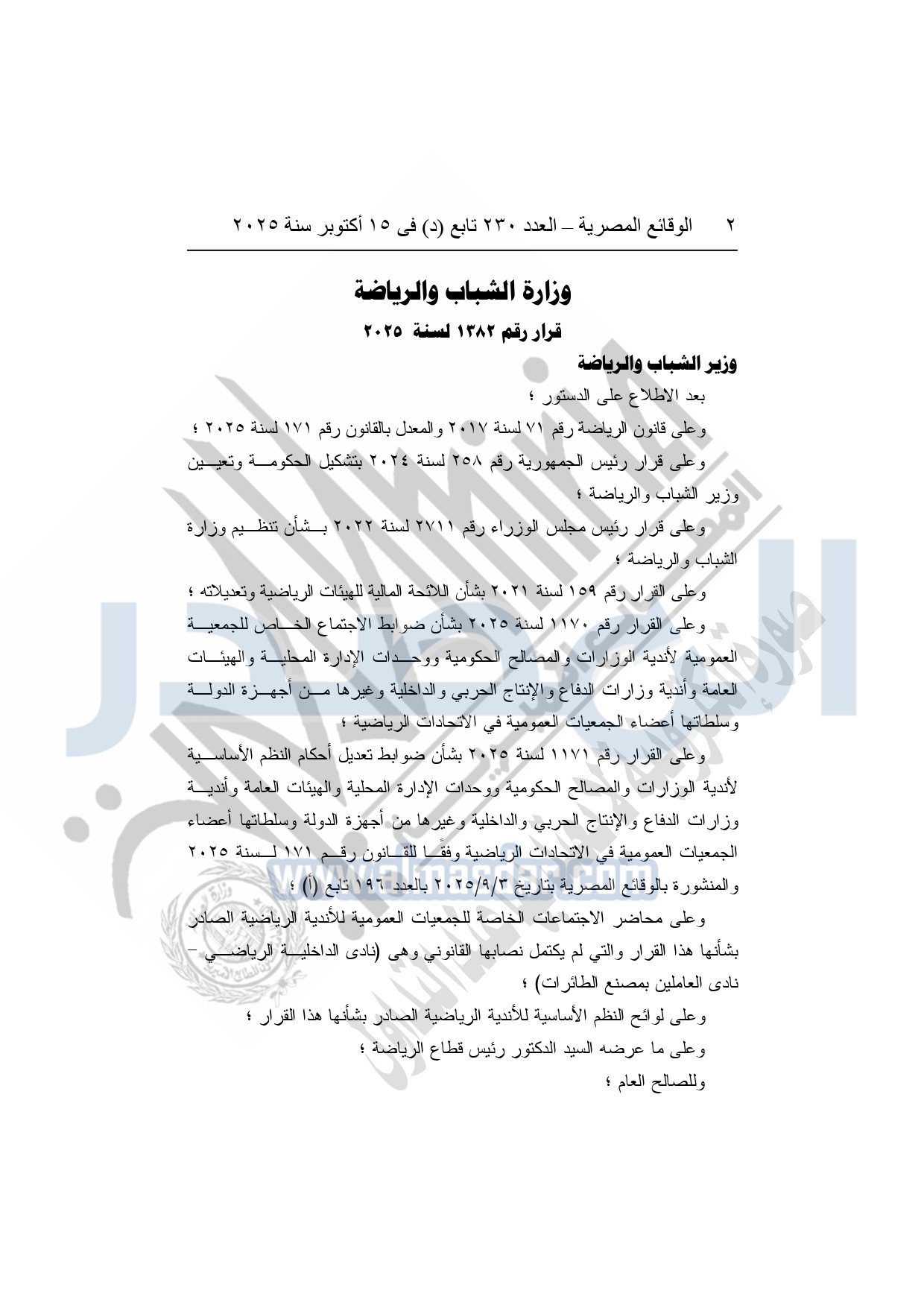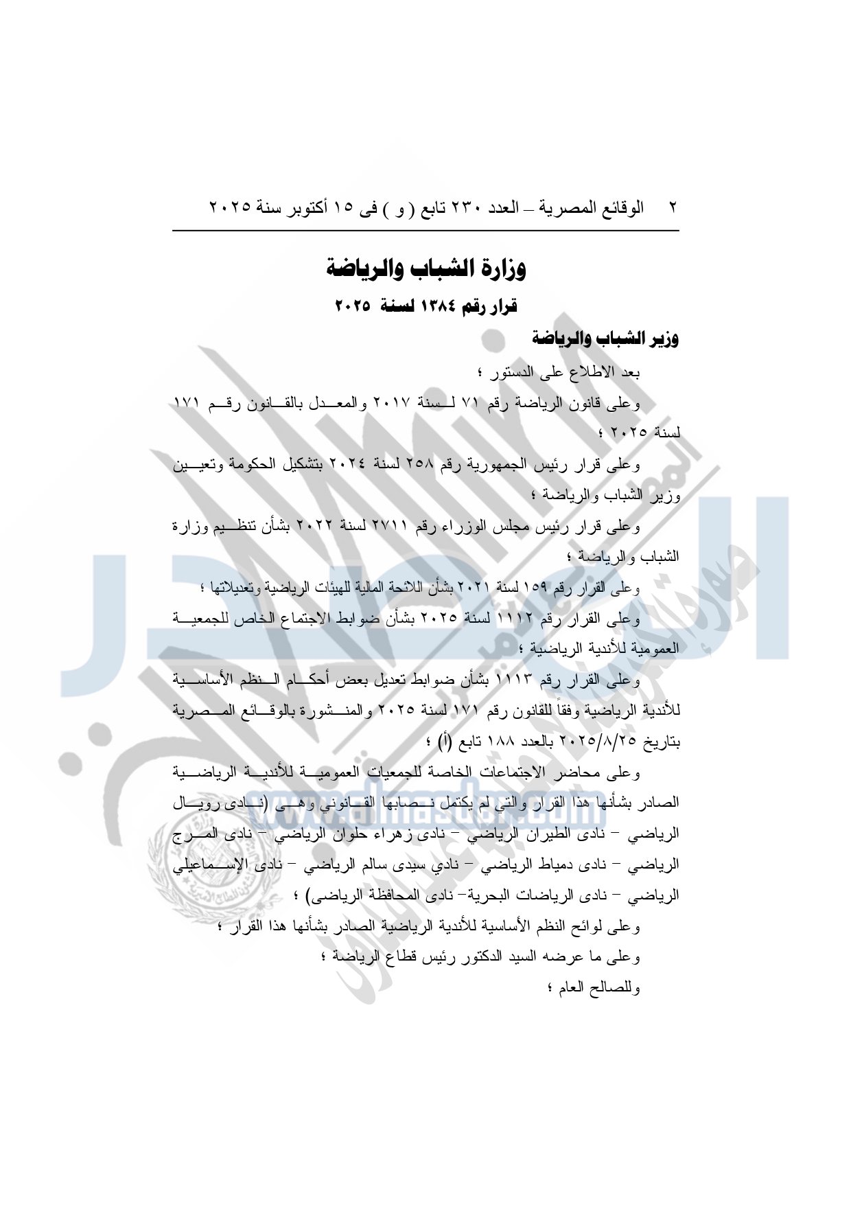 ونشرت الوقائع المصرية في العدد 230 تابع "د"، بتاريخ 15 أكتوبر 2025، قرار وزارة الشباب والرياضة، رقم 1382 لسنة 2025، بشأن تعديل بعض أحكام النظم الأساسية للأندية الرياضية.
