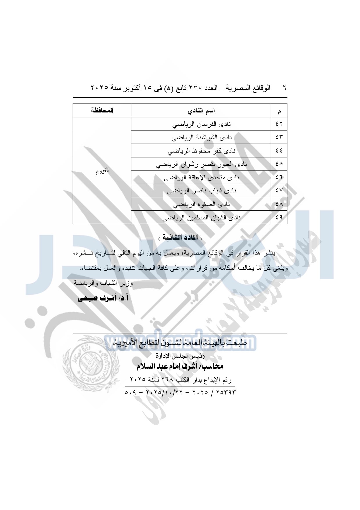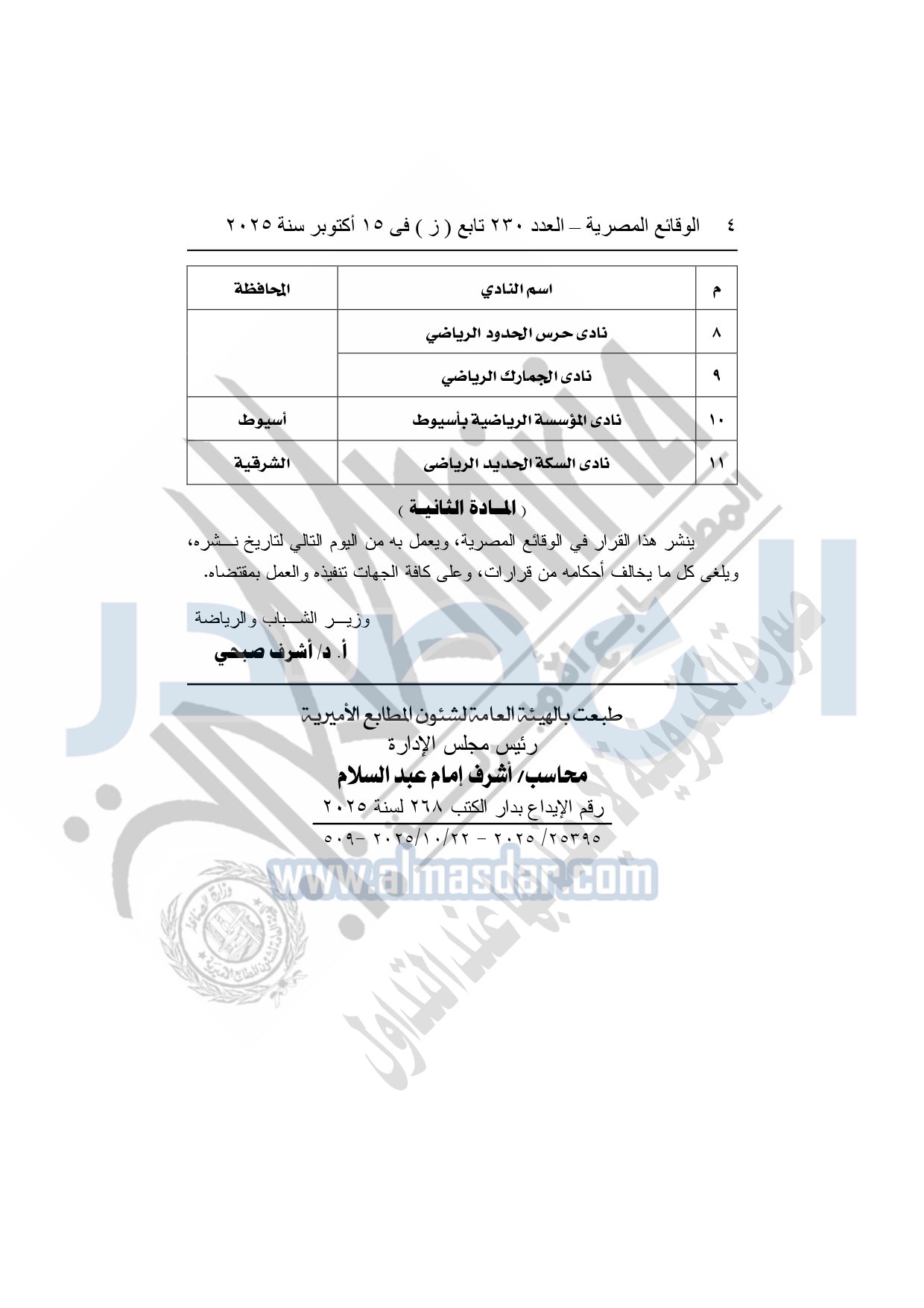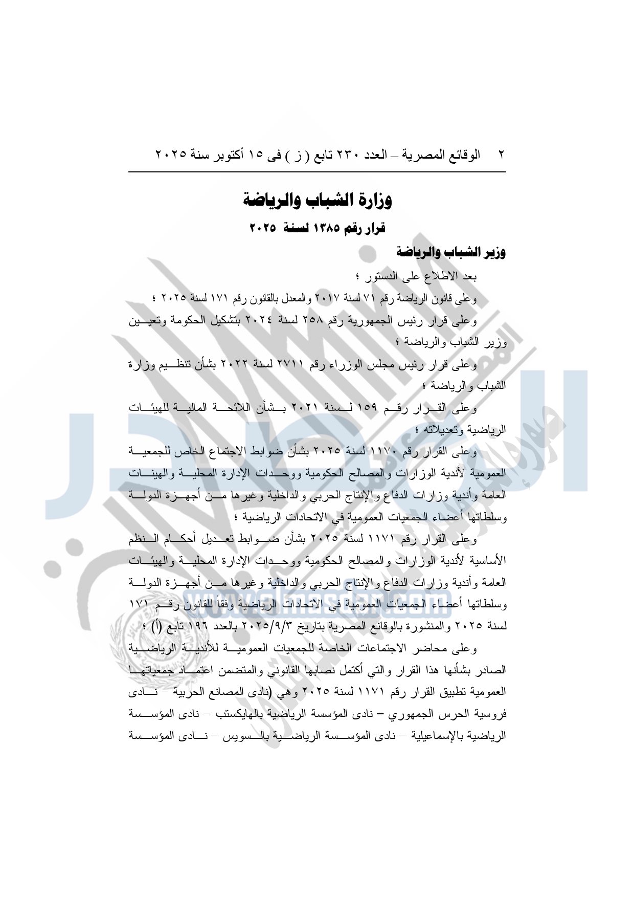 ونشرت الوقائع المصرية في العدد 230 تابع "د"، بتاريخ 15 أكتوبر 2025، قرار وزارة الشباب والرياضة، رقم 1382 لسنة 2025، بشأن تعديل بعض أحكام النظم الأساسية للأندية الرياضية.