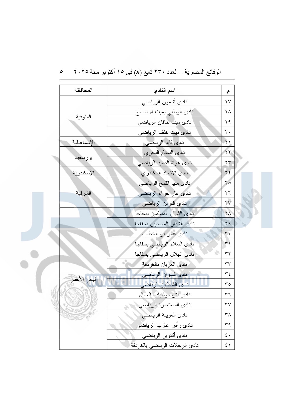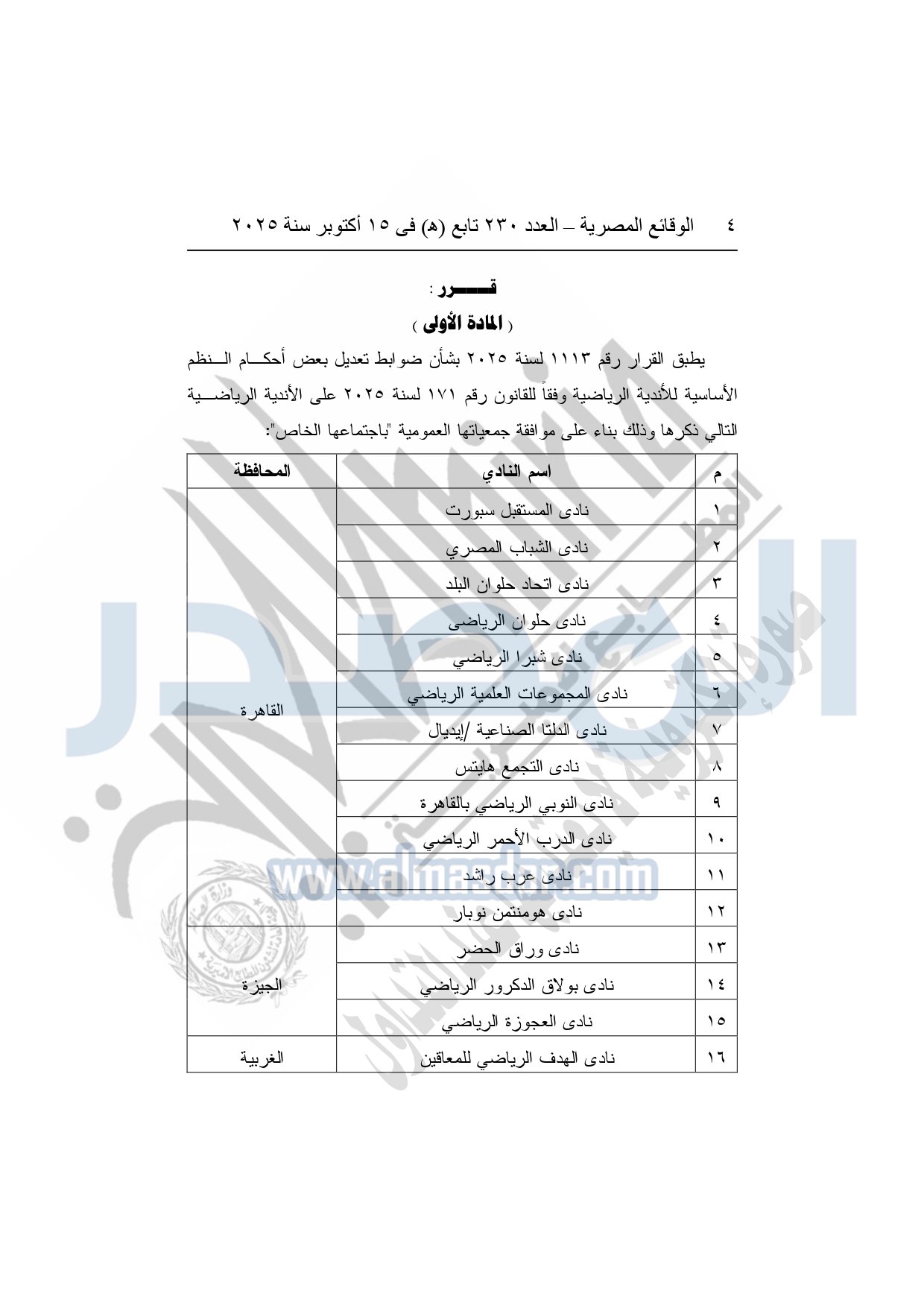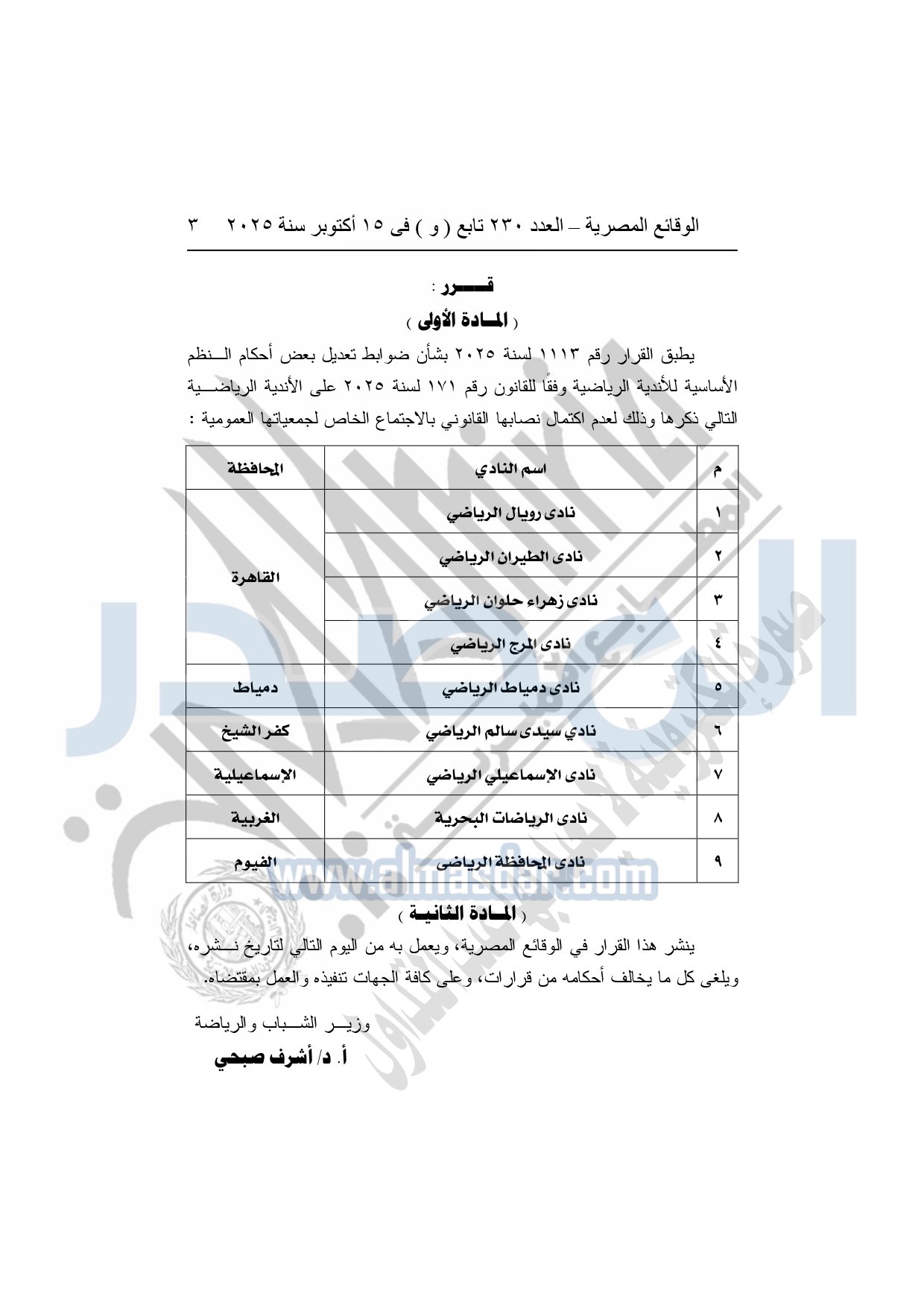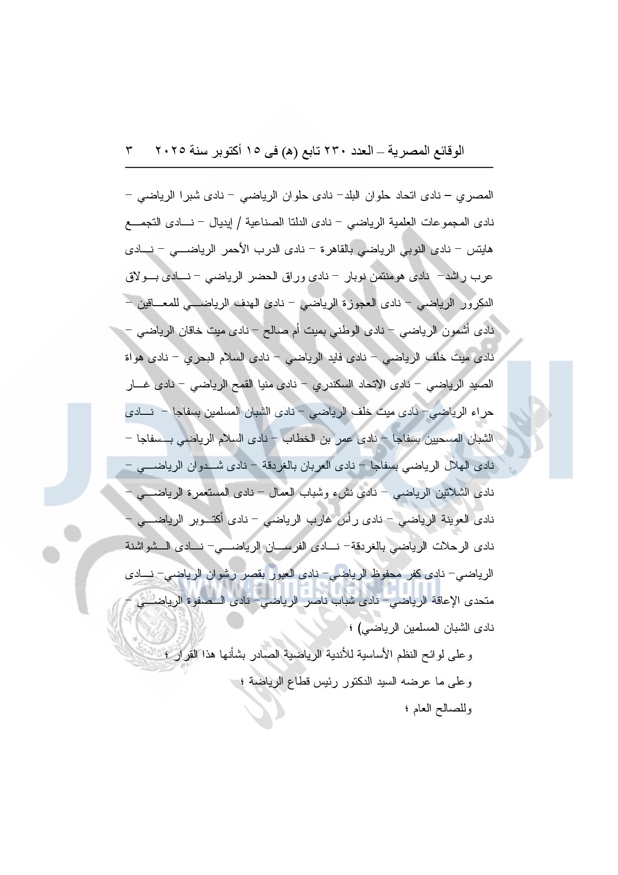 وأيضا نشرت الوقائع المصرية في العدد 230 تابع "هـ"، بتاريخ 15 أكتوبر 2025، قرار وزارة الشباب والرياضة، رقم 1383 لسنة 2025، بشأن تعديل بعض أحكام النظم الأساسية للأندية الرياضية.
