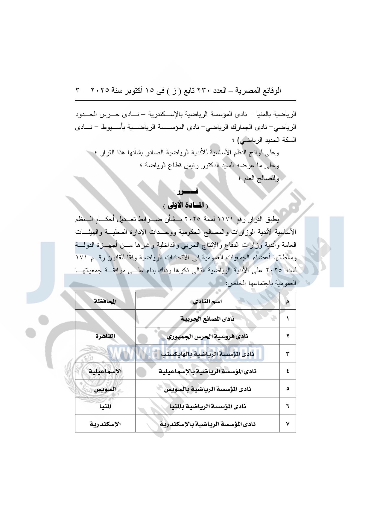 يطبق القرار رقم 1171 لسنة 2025 بشأن ضوابط تعديل أحكام النظم الأساسية لأندية الوزارات والمصالح الحكومية ووحدات الإدارة المحلية والهيئات العامة وأندية وزارات الدفاع والإنتاج الحربي والداخلية وغيرها من أجهزة الدولة وسلطاتها أعضاء الجمعيات العمومية في الاتحادات الرياضية وفقاً للقانون رقم 171 لسنة 2025 علـى الأندية الرياضية التالي ذكرها وذلك لعدم اكتمال نصابها القانوني بالاجتماع الخاص لجمعياتها العمومية: