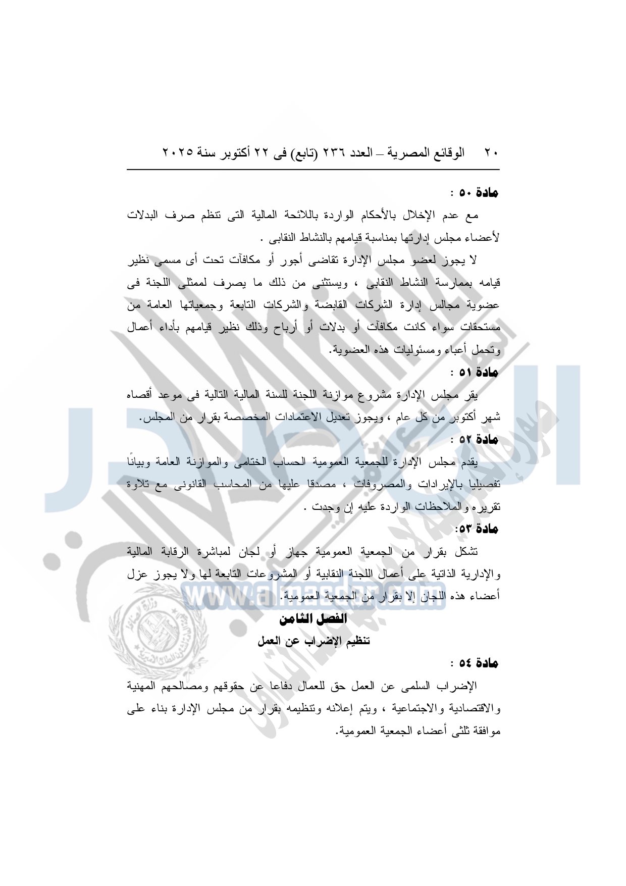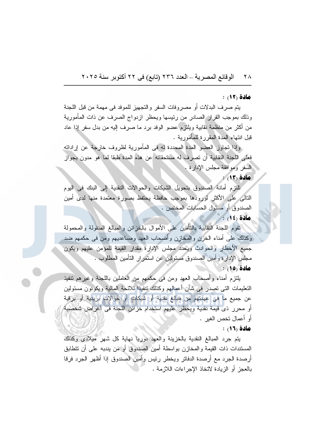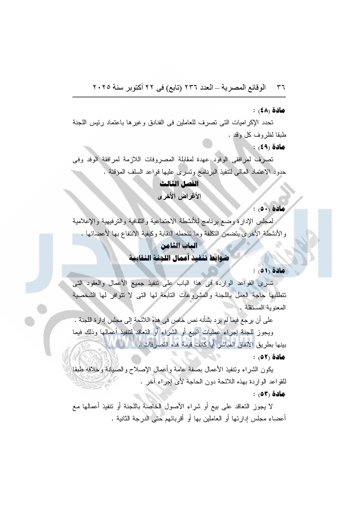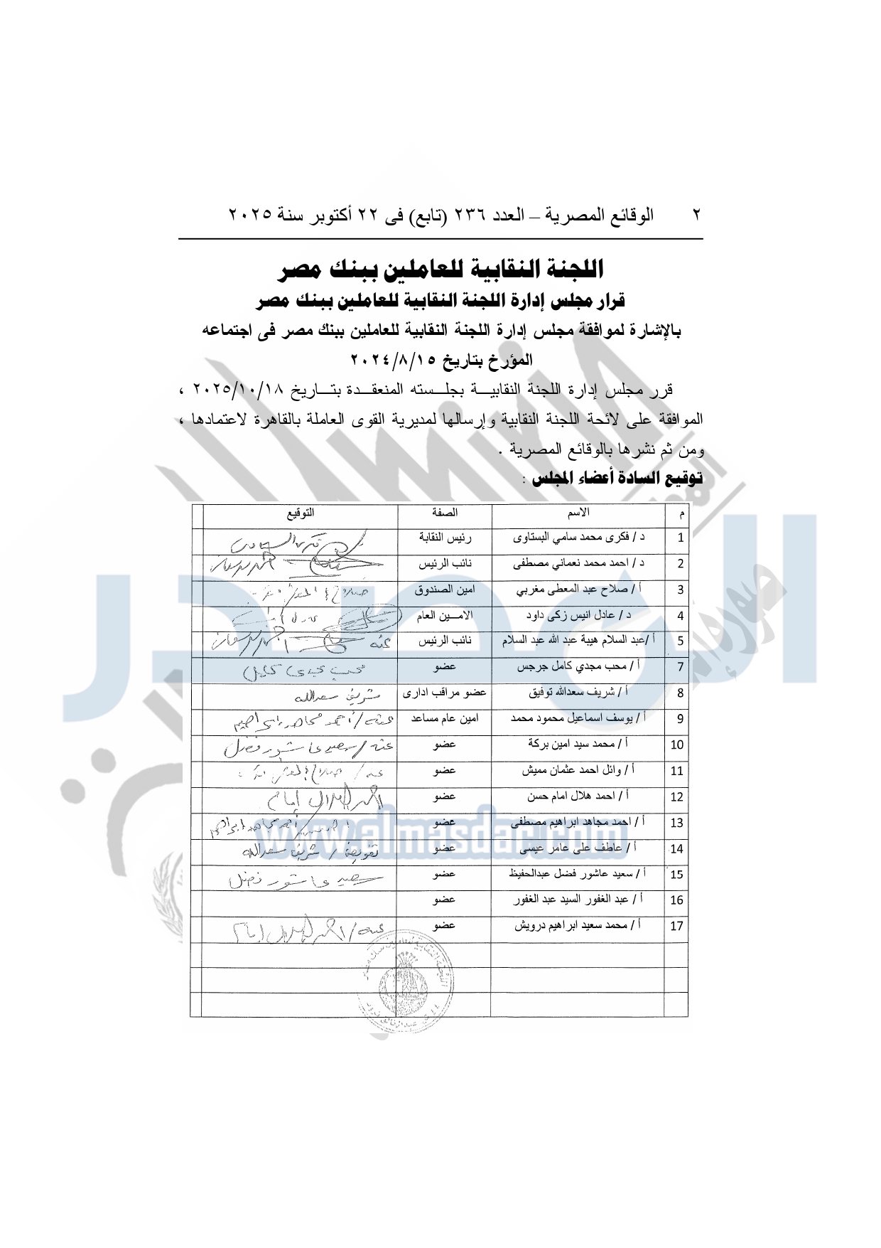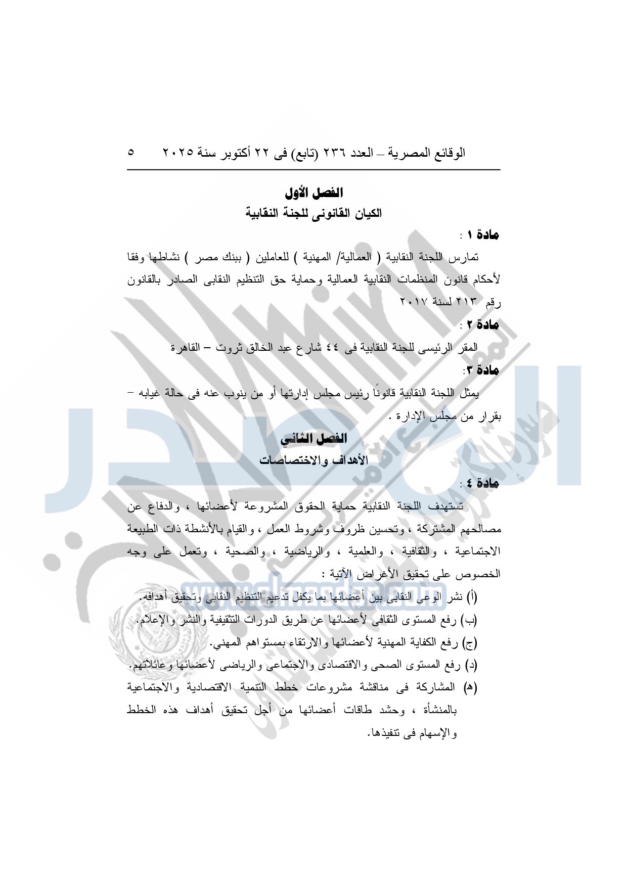 نشرت الوقائع المصرية في العدد 236 "تابع" الصادر في 22 أكتوبر سنة 2025، لائحة اللجنة النقابية للعاملين ببنك مصر.