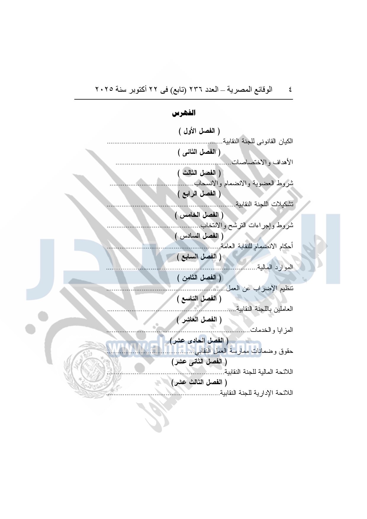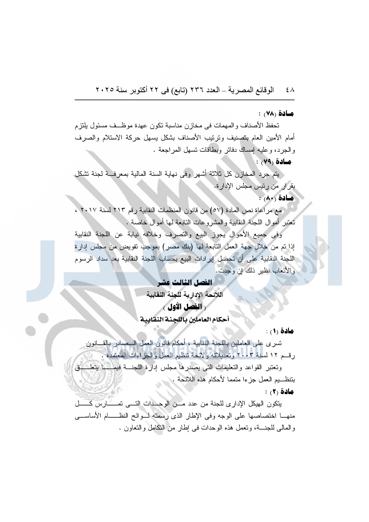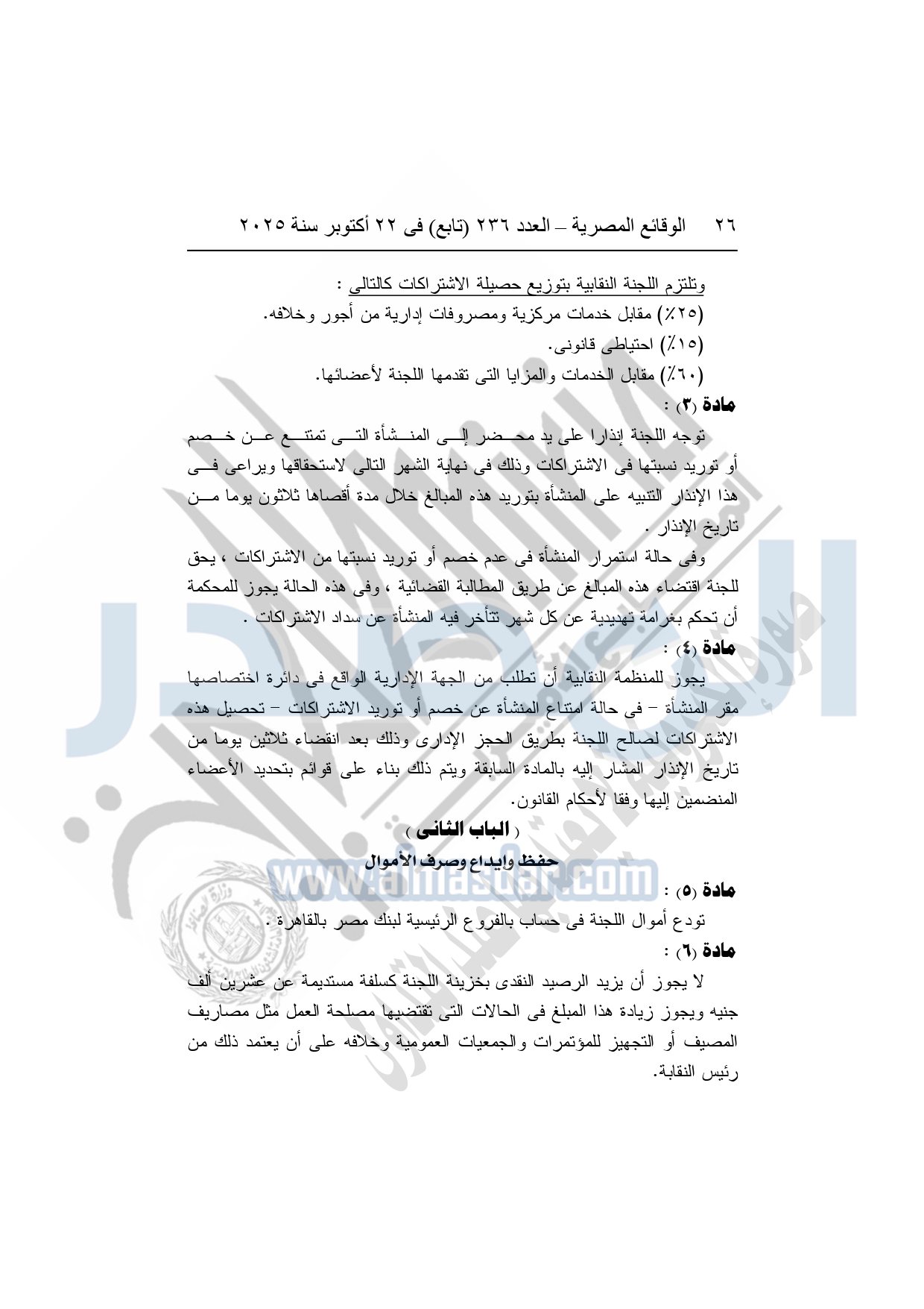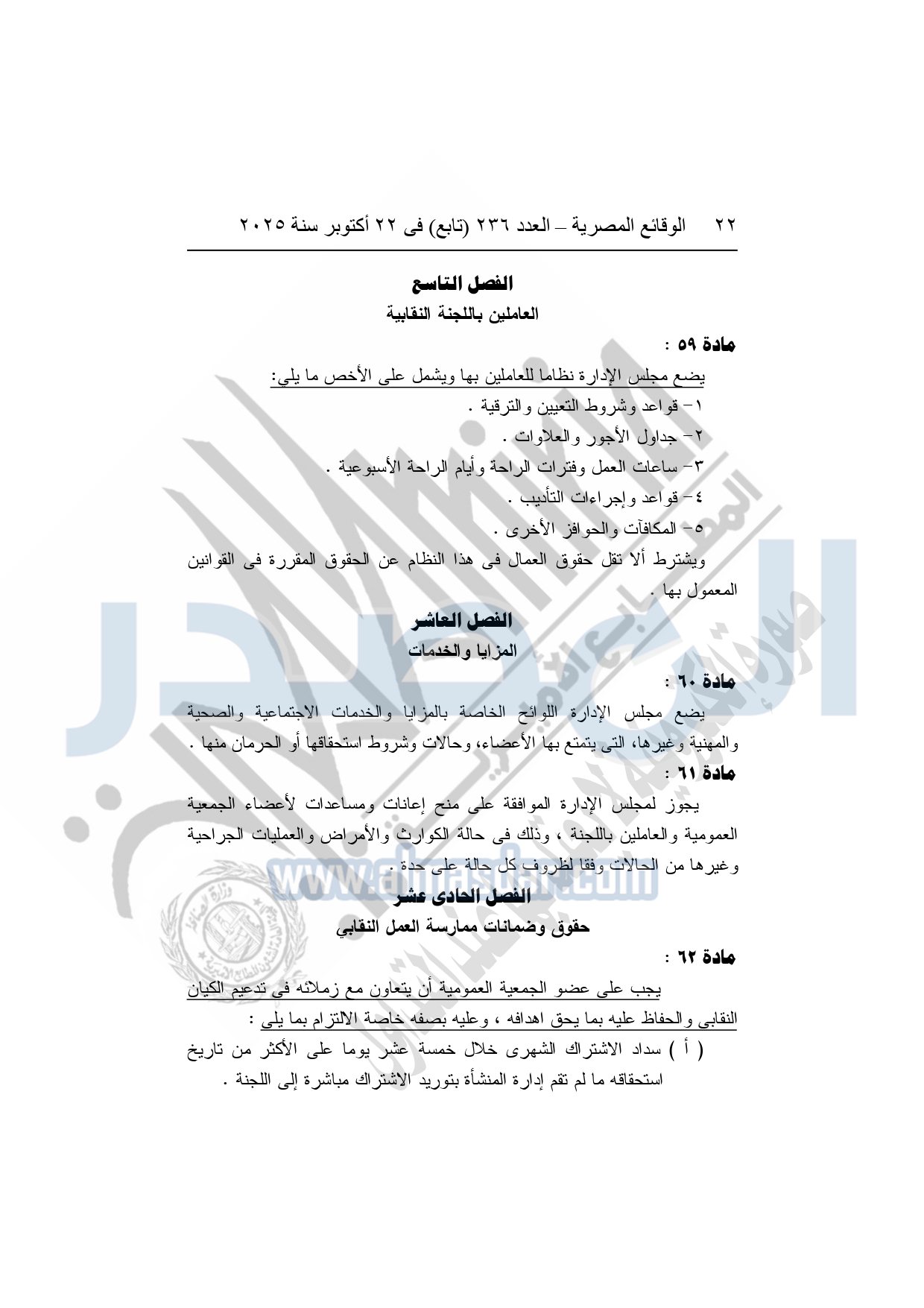 نشرت الوقائع المصرية في العدد 236 "تابع" الصادر في 22 أكتوبر سنة 2025، لائحة اللجنة النقابية للعاملين ببنك مصر.