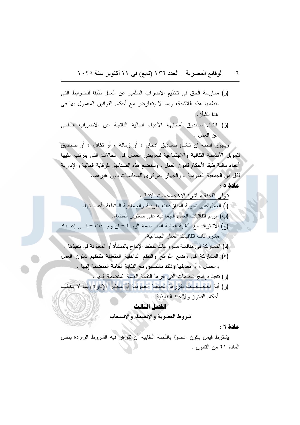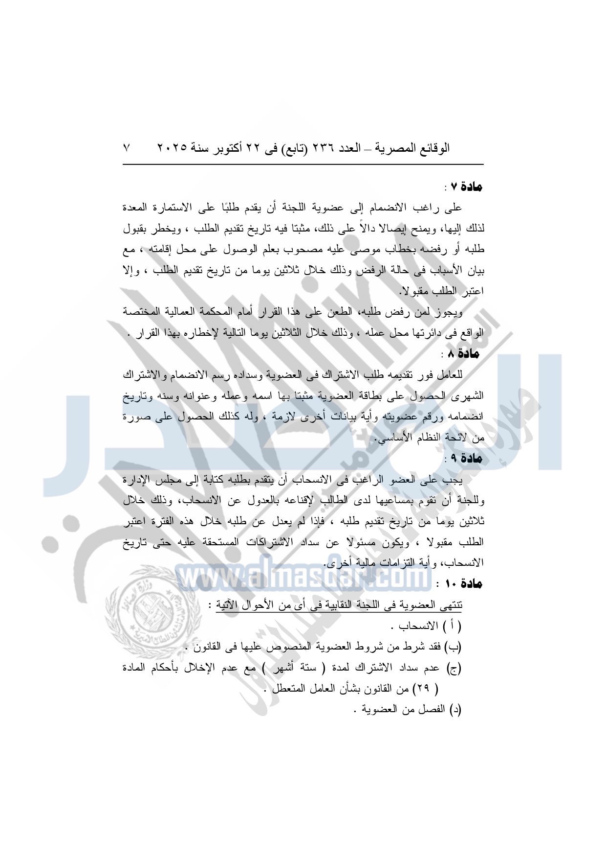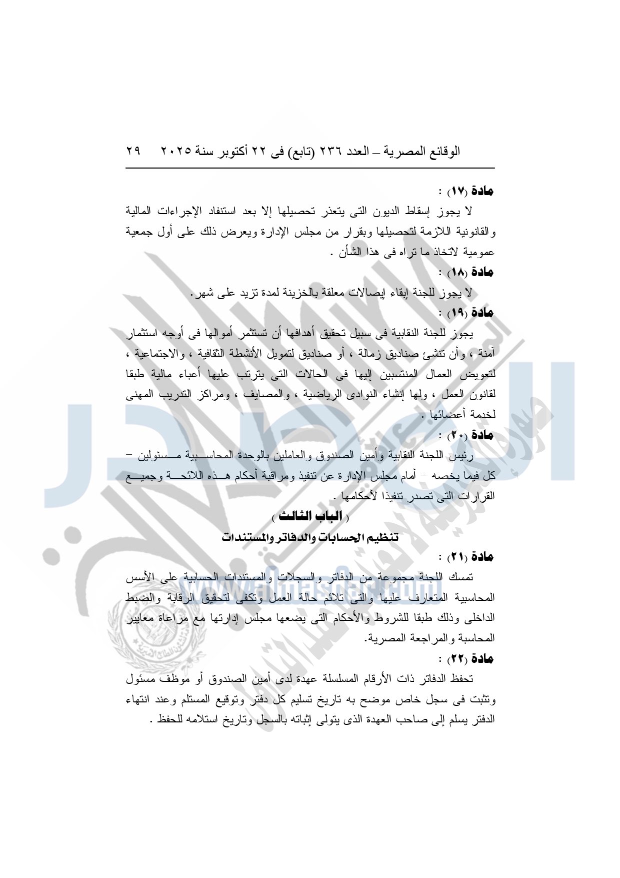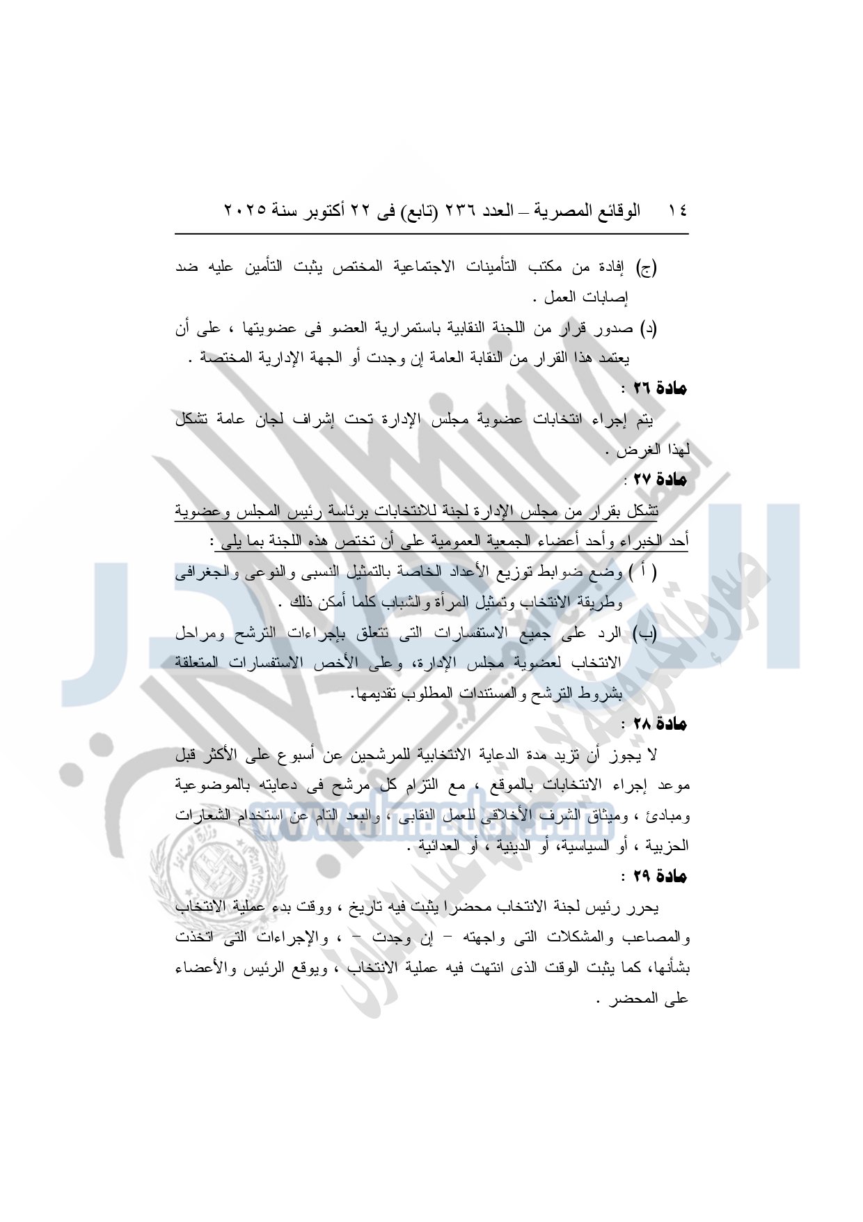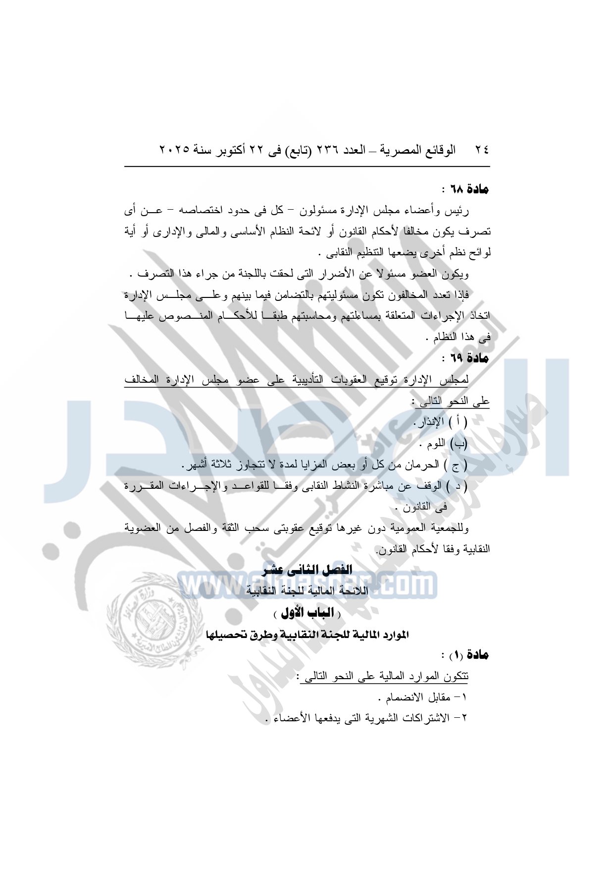 نشرت الوقائع المصرية في العدد 236 "تابع" الصادر في 22 أكتوبر سنة 2025، لائحة اللجنة النقابية للعاملين ببنك مصر.