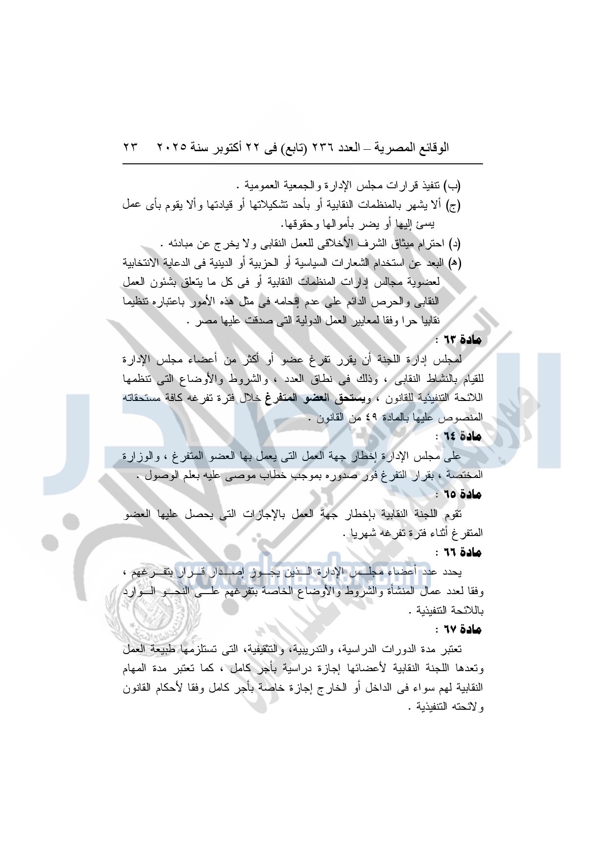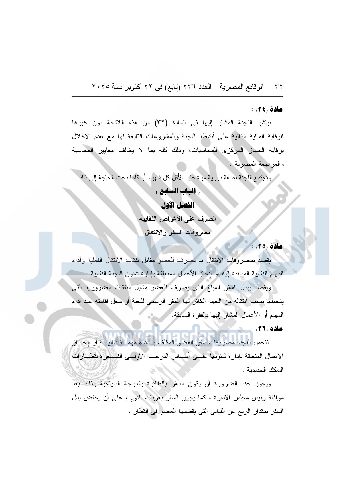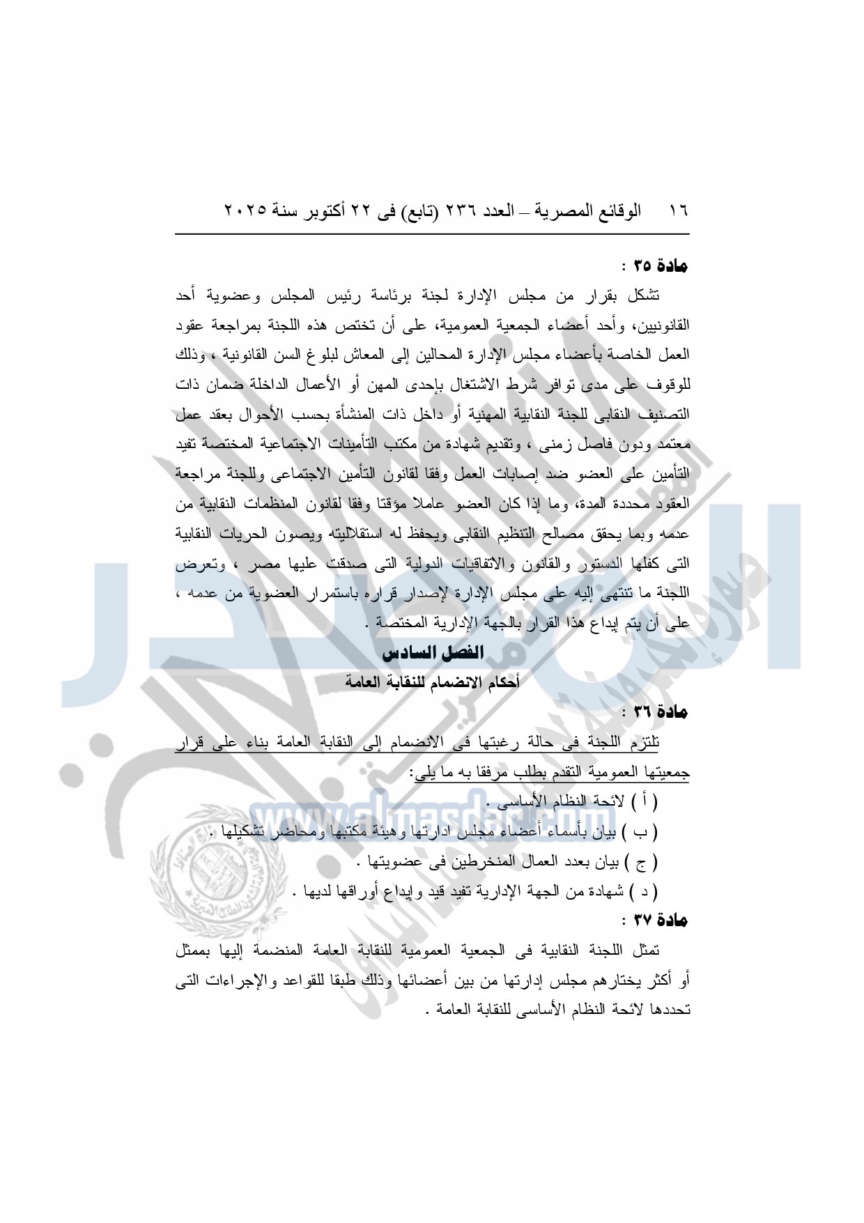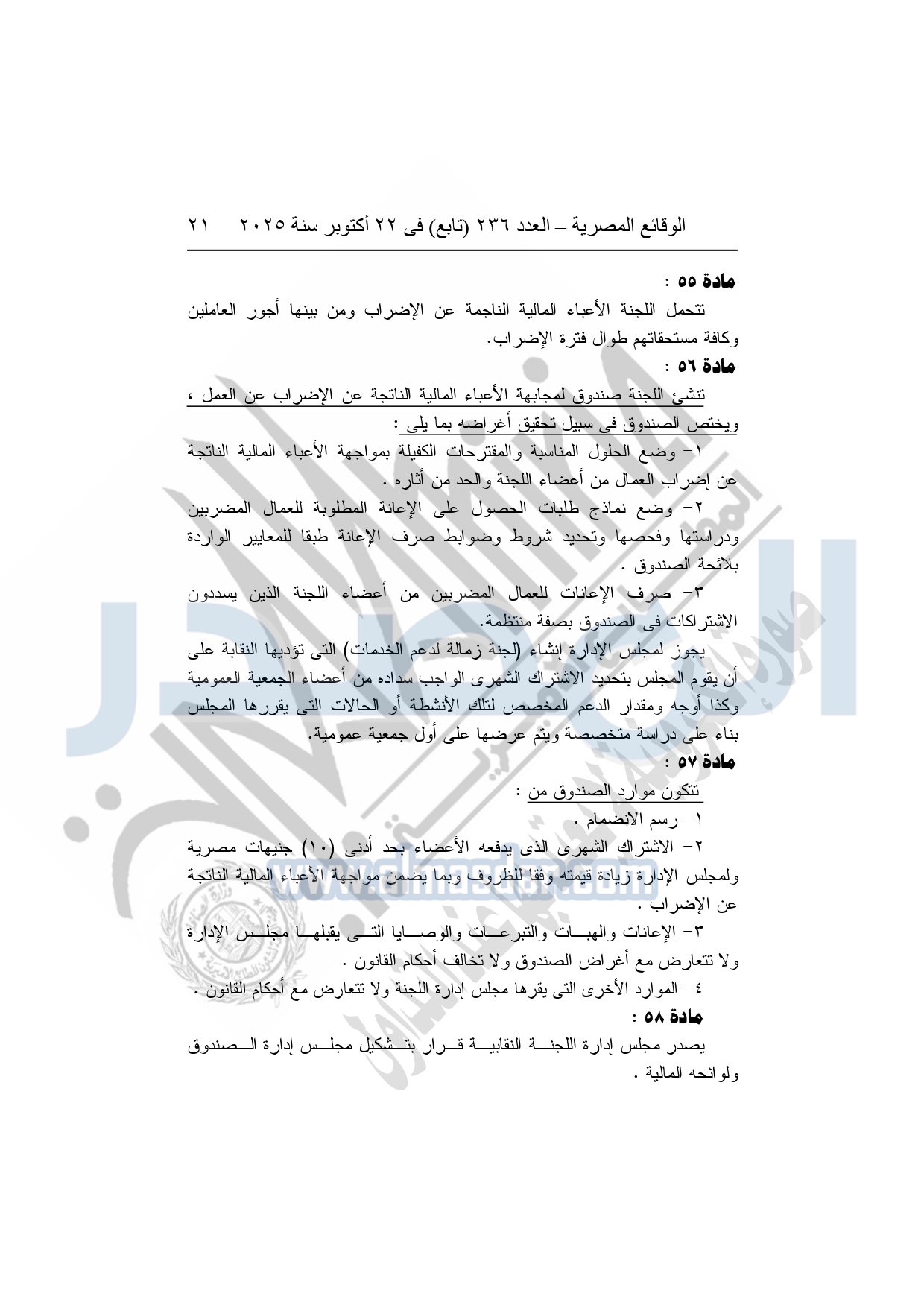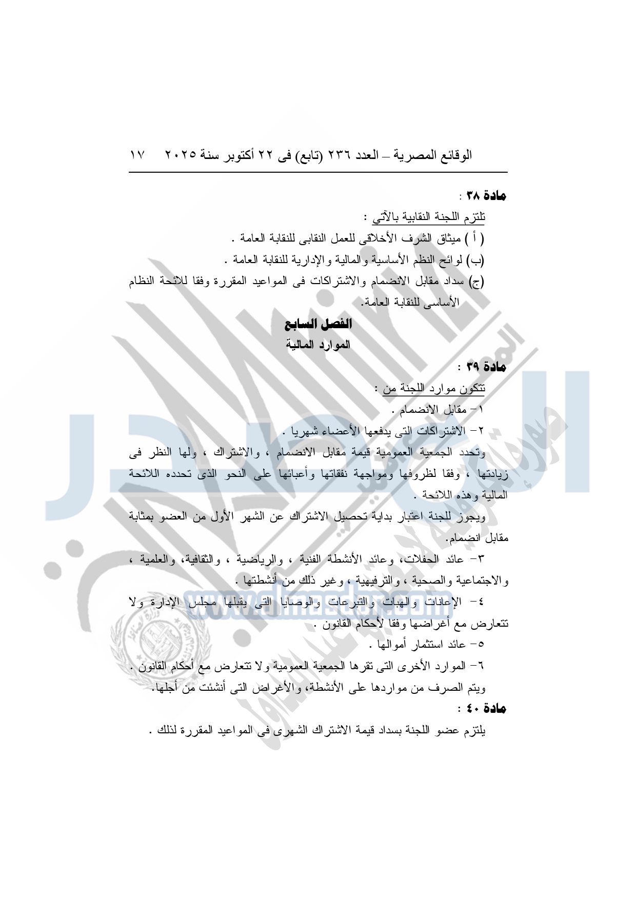 نشرت الوقائع المصرية في العدد 236 "تابع" الصادر في 22 أكتوبر سنة 2025، لائحة اللجنة النقابية للعاملين ببنك مصر.