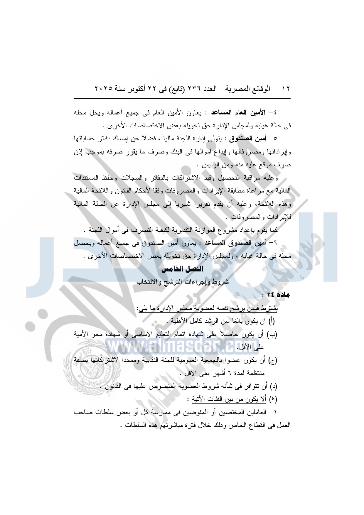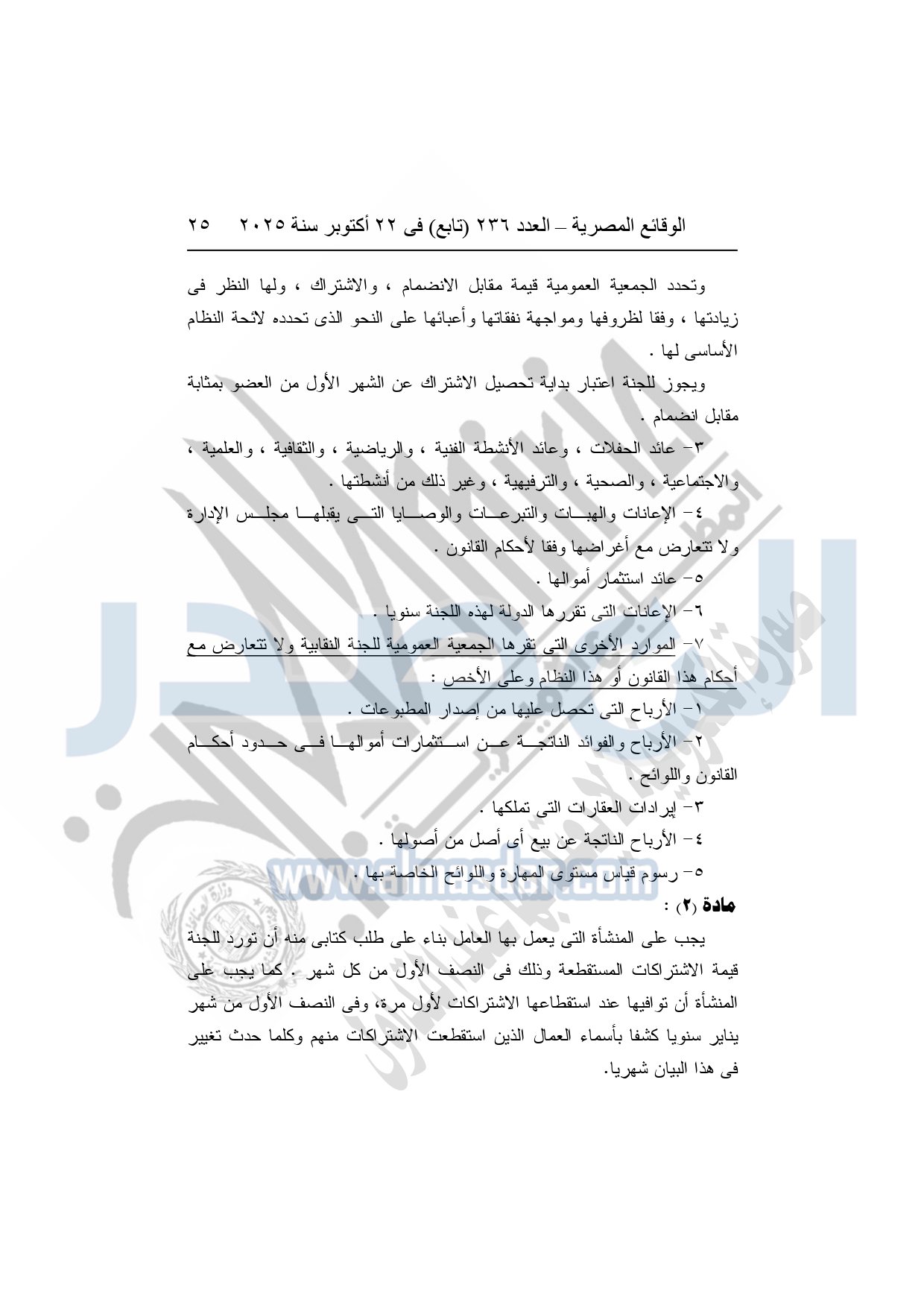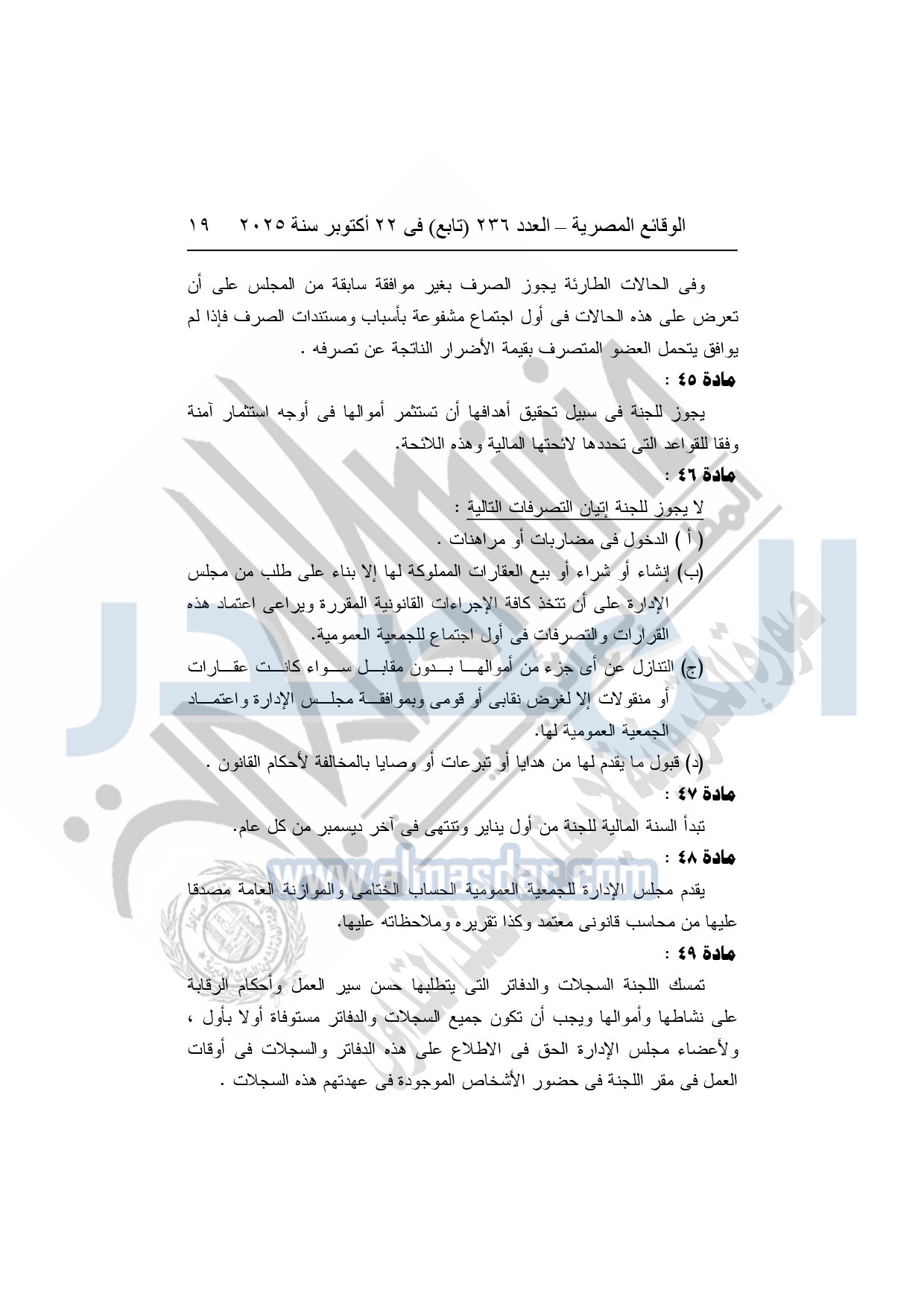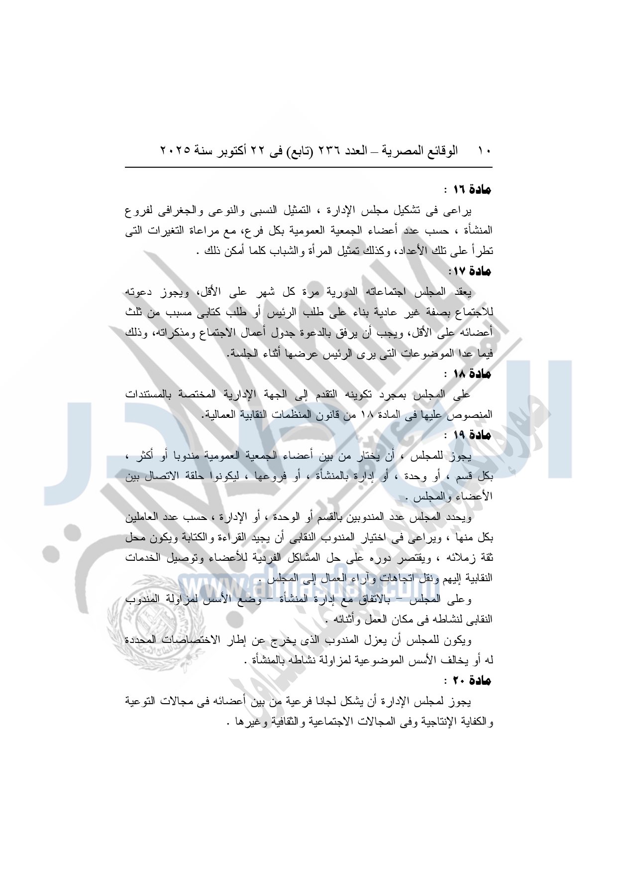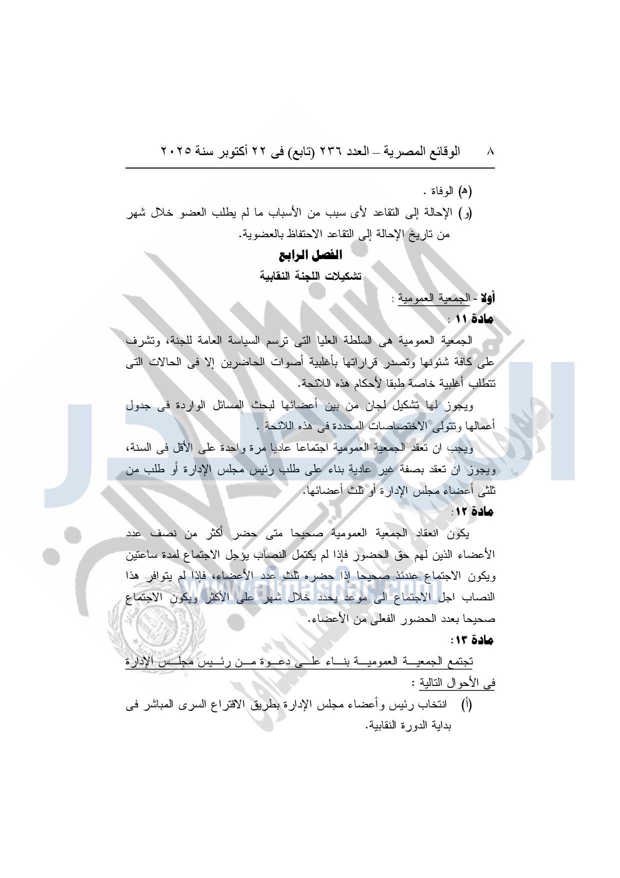 نشرت الوقائع المصرية في العدد 236 "تابع" الصادر في 22 أكتوبر سنة 2025، لائحة اللجنة النقابية للعاملين ببنك مصر.