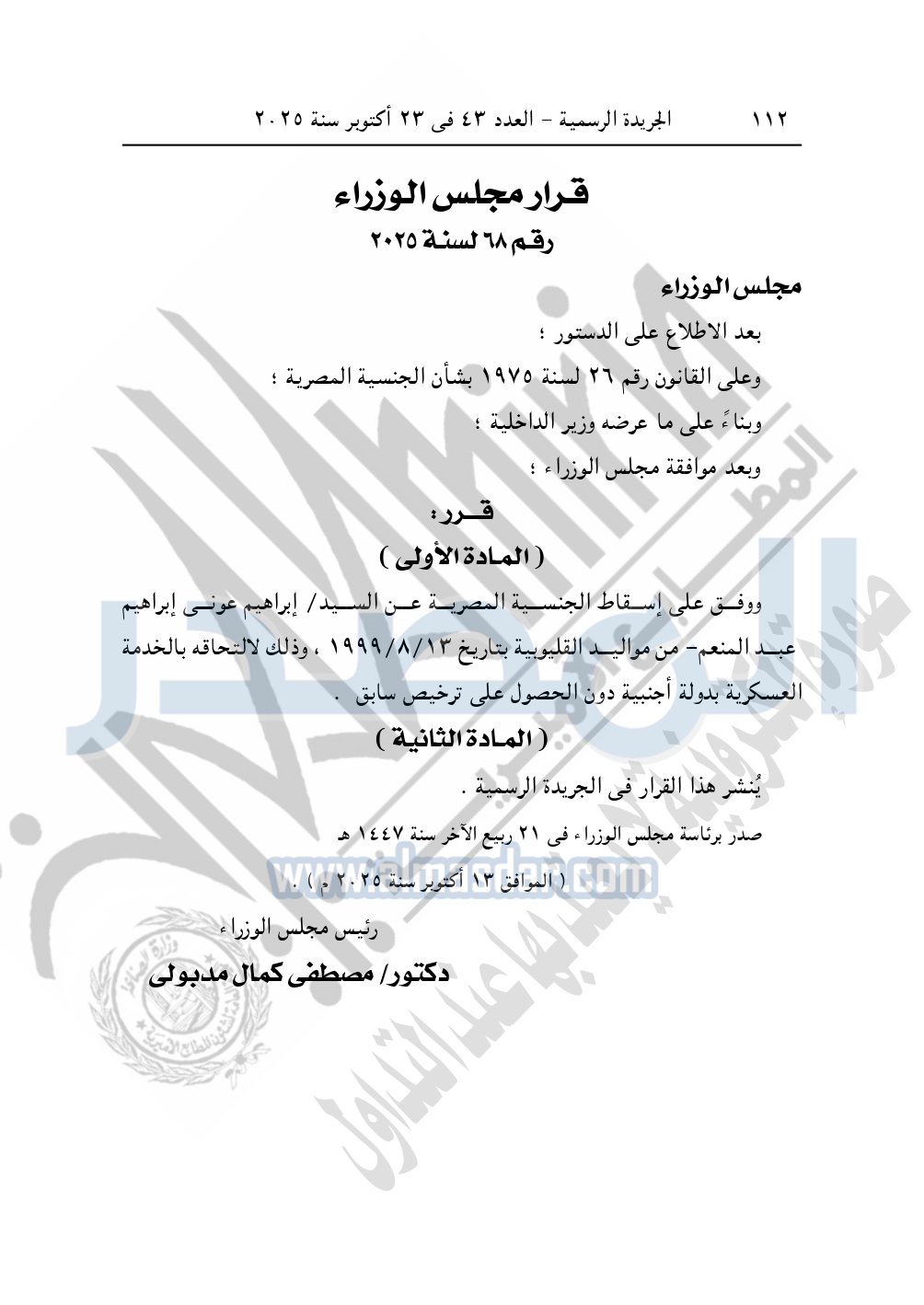 كما نشرت الجريدة الرسمية في العدد 43، الصادر بتاريخ 23 أكتوبر 2025، قرار رئيس مجلس الوزراء، رقم 69 لسنة 2025، بشأن الموافقة على إسقاط الجنسية المصرية.