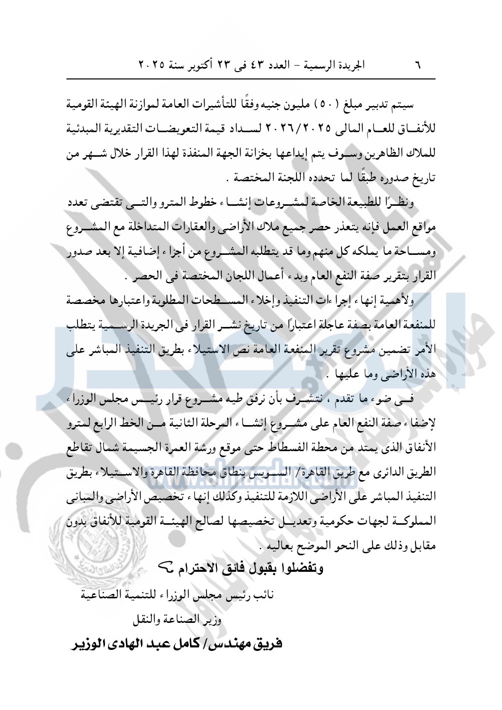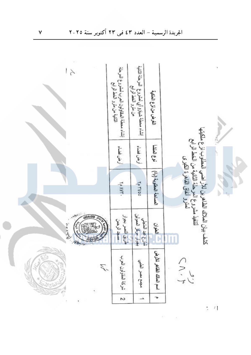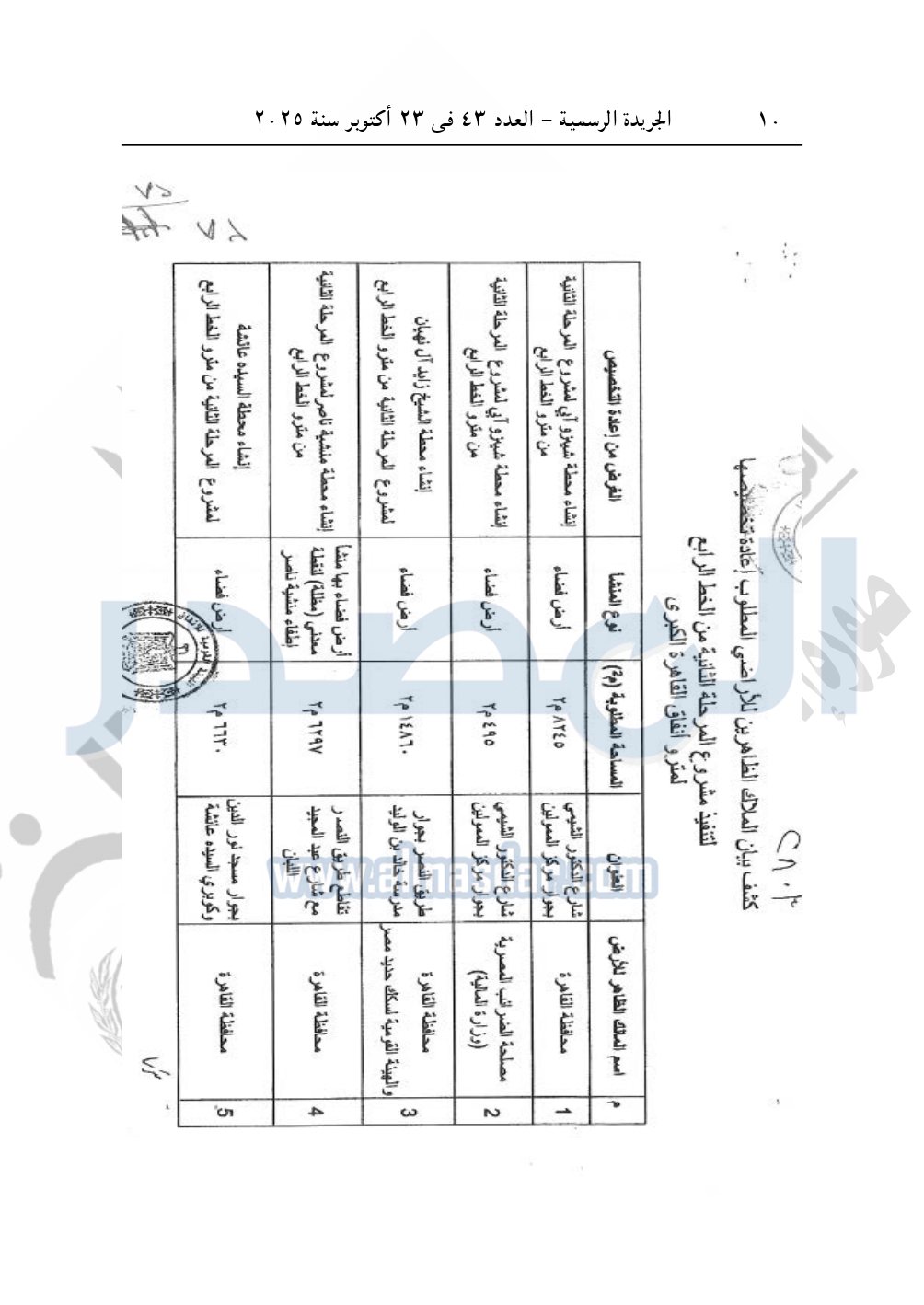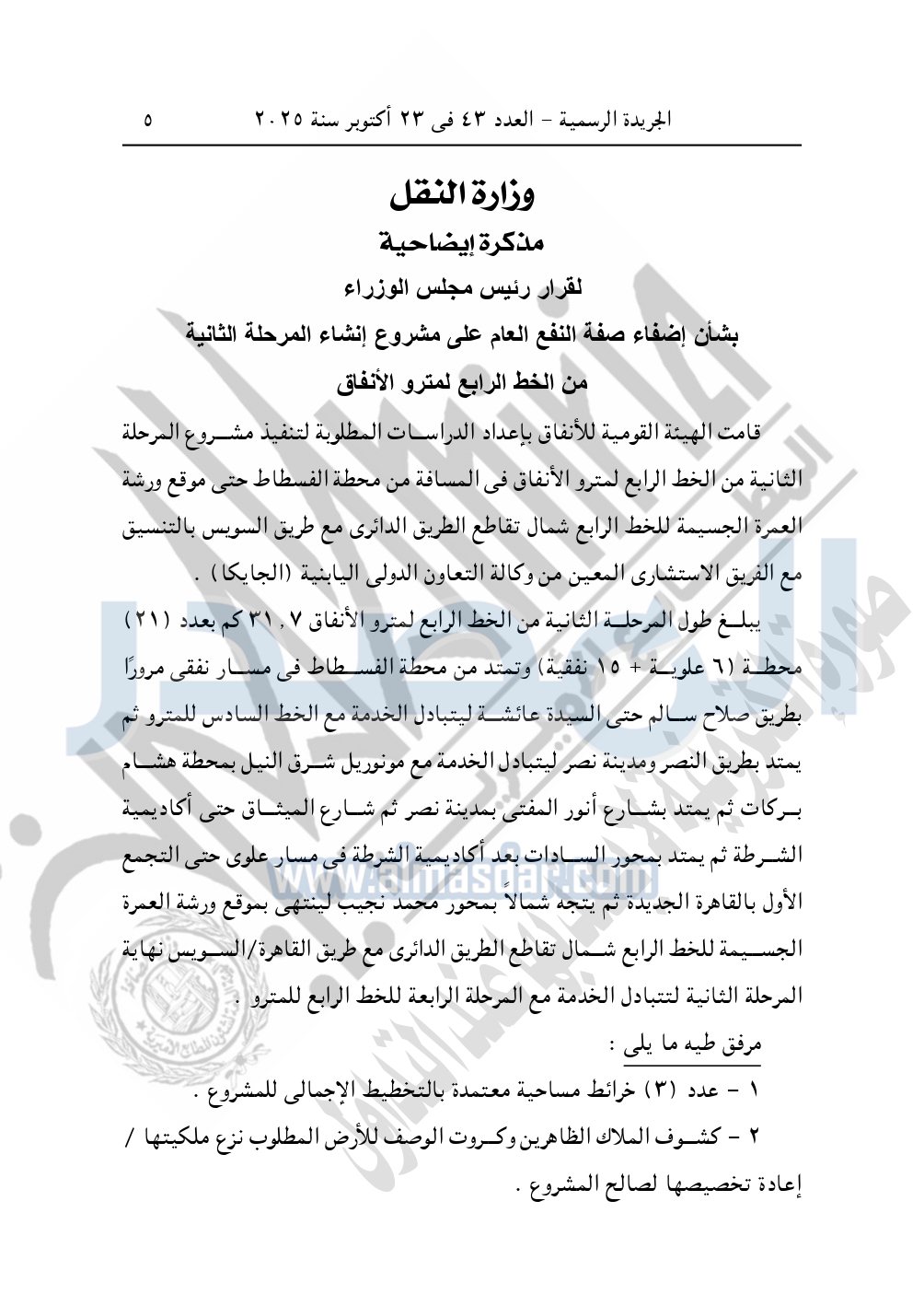 نشرت الجريدة الرسمية في العدد 43، الصادر بتاريخ 23 أكتوبر 2025، قرار رئيس مجلس الوزراء، رقم 2803 لسنة 2025، بشأن نزع ملكية أراضي لإنشاء مشروع المرحلة الثانية من الخط الرابع لمترو الأنفاق.