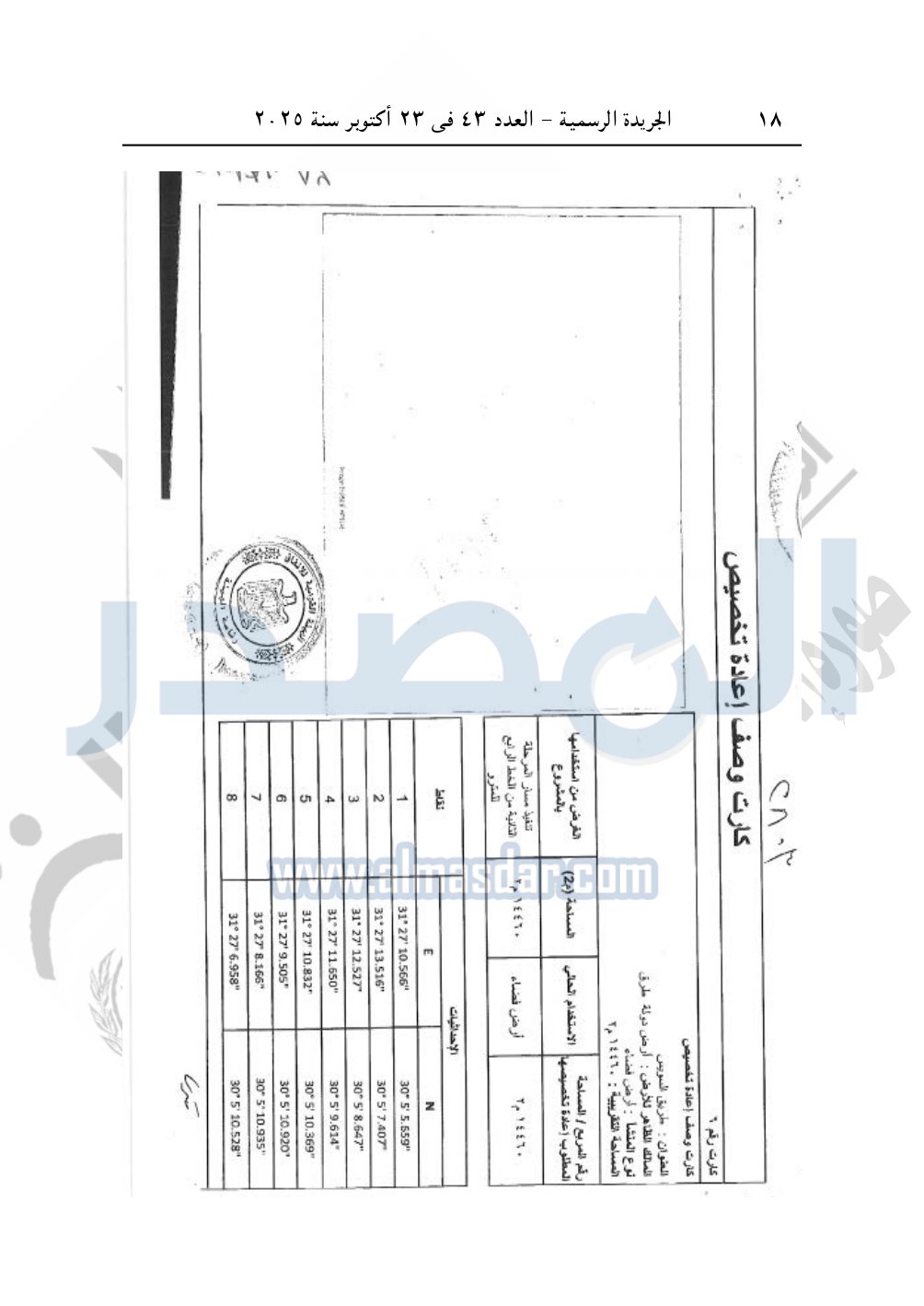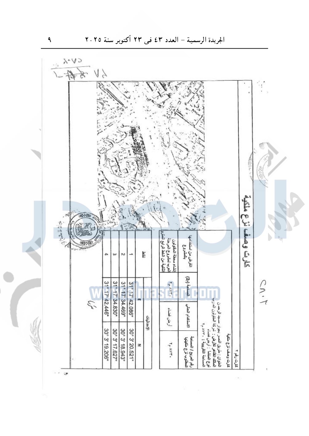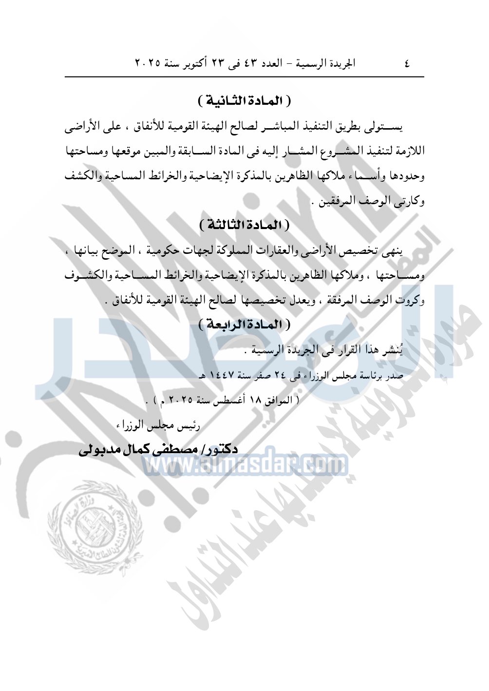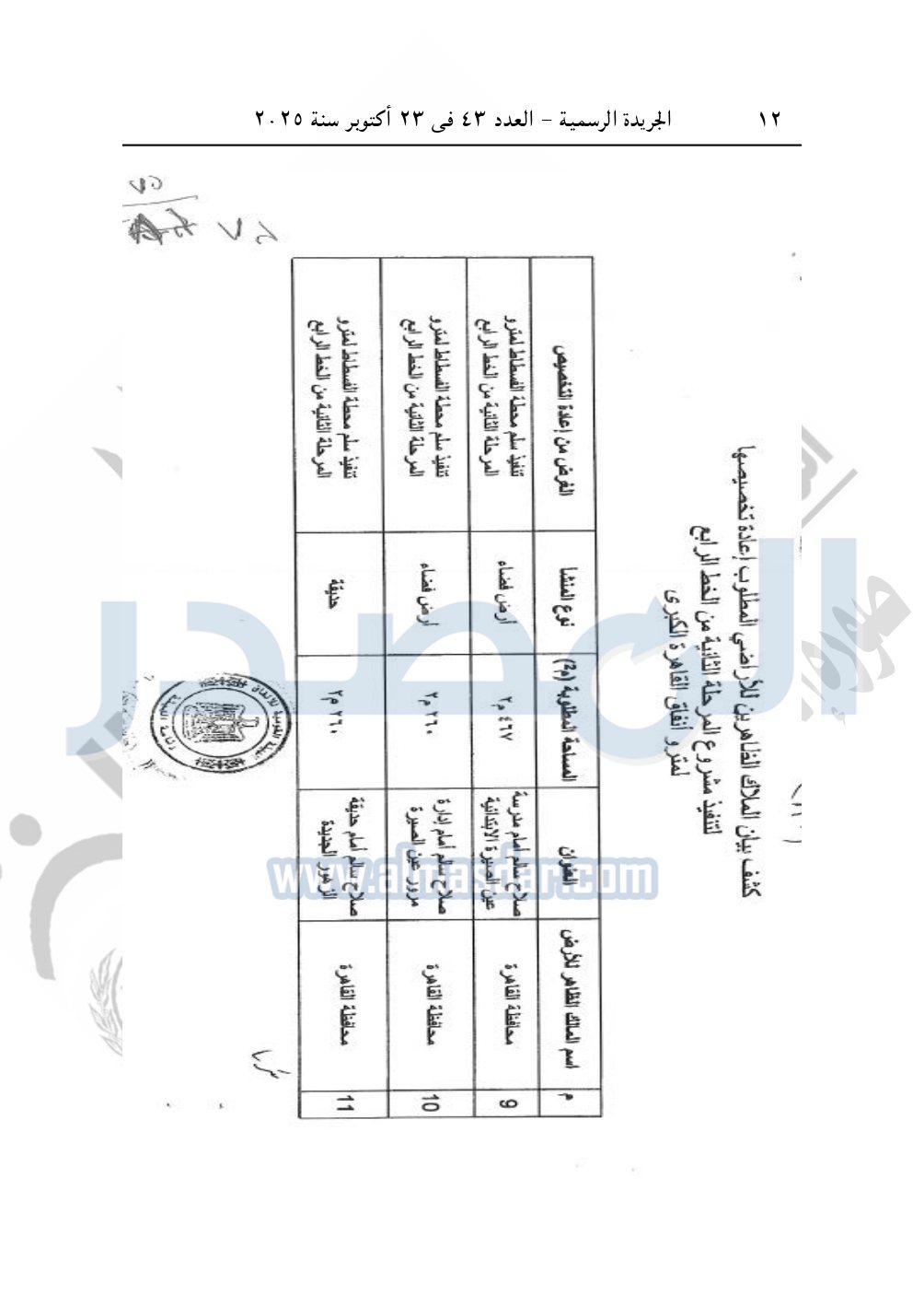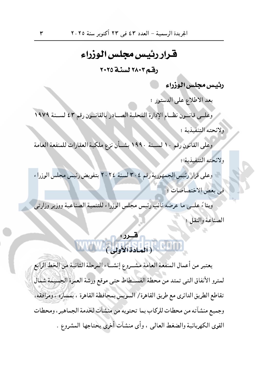 نشرت الجريدة الرسمية في العدد 43، الصادر بتاريخ 23 أكتوبر 2025، قرار رئيس مجلس الوزراء، رقم 2803 لسنة 2025، بشأن نزع ملكية أراضي لإنشاء مشروع المرحلة الثانية من الخط الرابع لمترو الأنفاق.