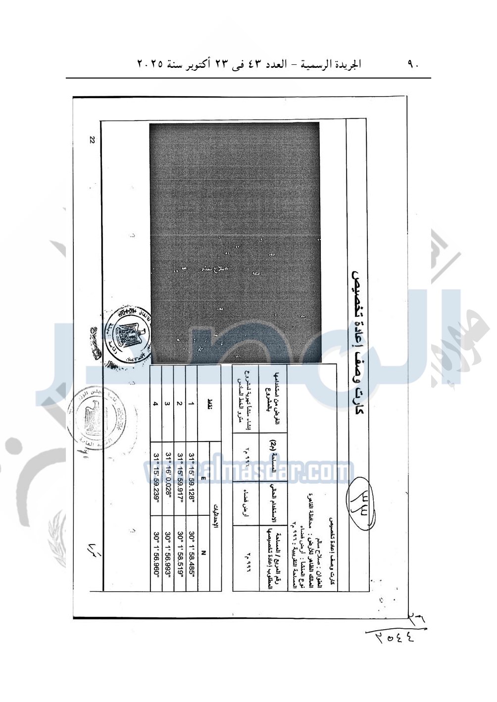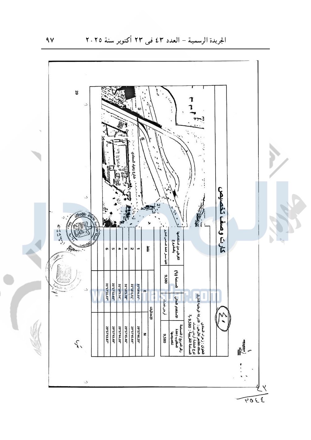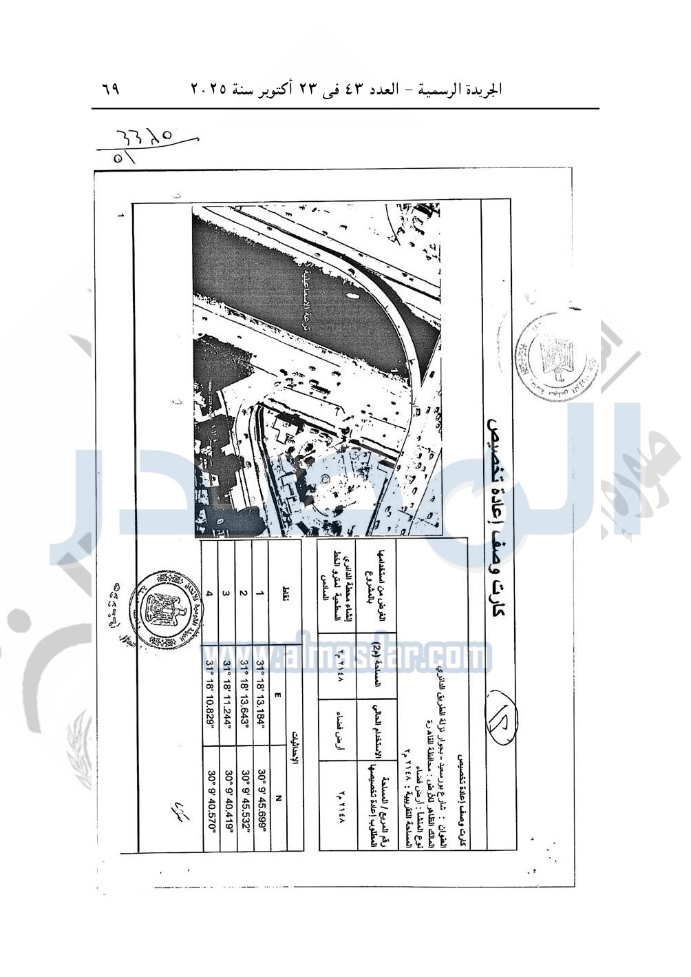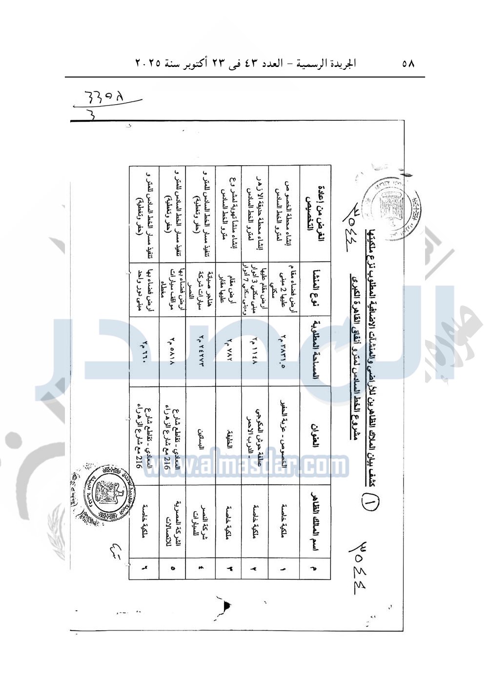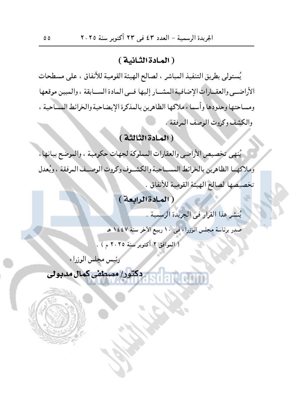 تخصيص الأراضى والعقارات المملوكة لجهات حكومية، والموضح بيانها، وملاكها الظاهرين بالخرائط المساحية والكشوف وكروت الوصف المرفقة، ويُعدل تخصيصها لصالح الهيئة القومية للأنفاق.
