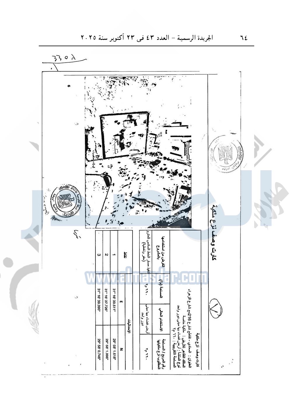 يستولى بطريق التنفيذ المباشر، لصالح الهيئة القومية للأنفاق، على مسطحات الأراضي والعقارات الإضافية المشار إليها فى المادة السابقة، والمبين موقعها ومساحتها وحدودها وأسماء ملاكها الظاهرين بالمذكرة الإيضاحية والخرائط المساحية، والكشف وكروت الوصف المرفقة.