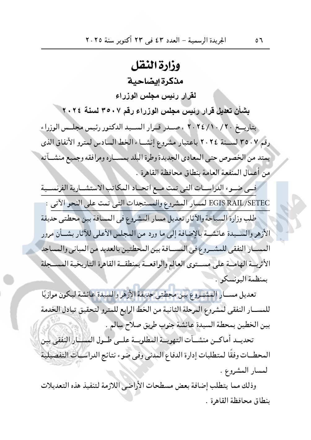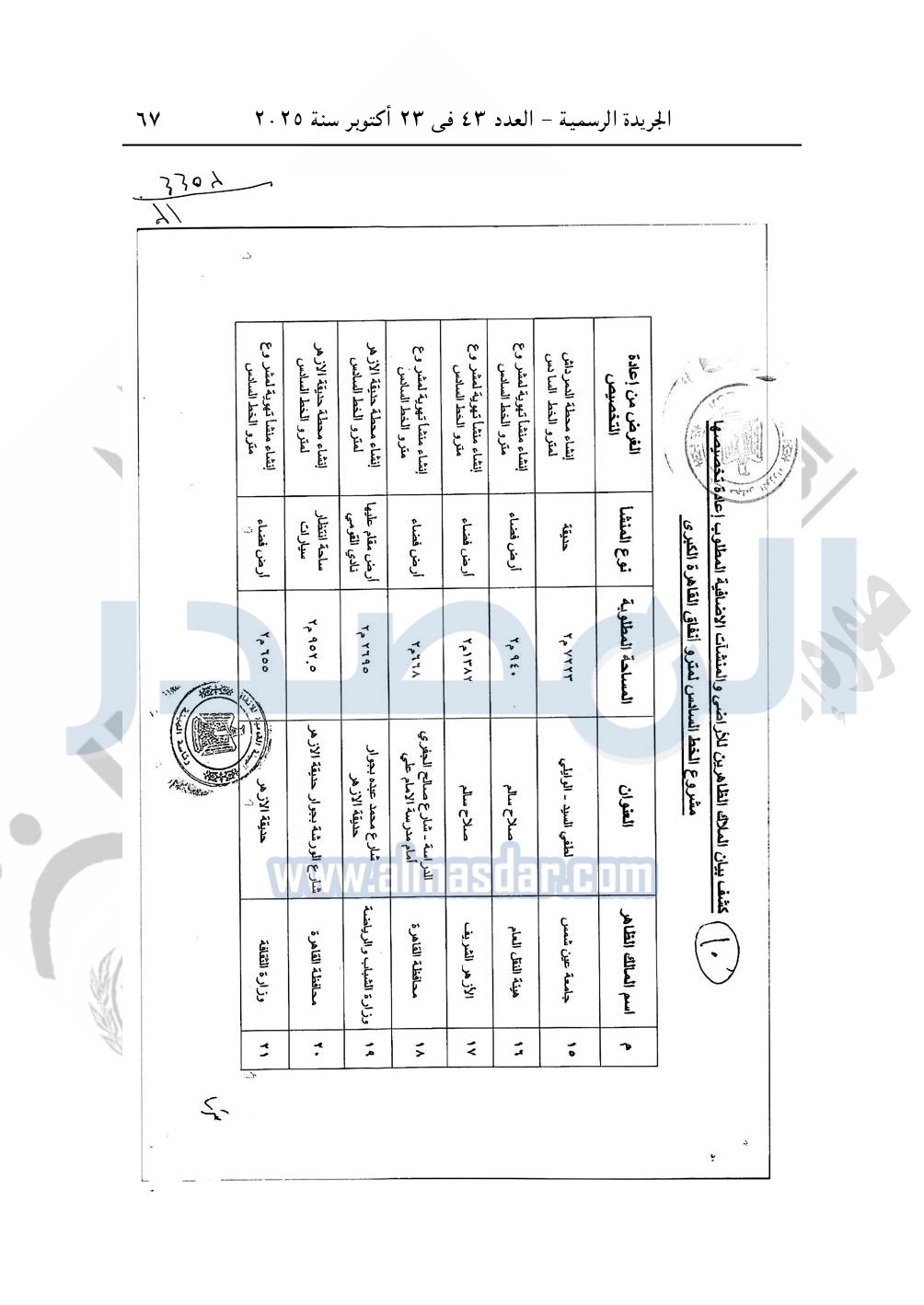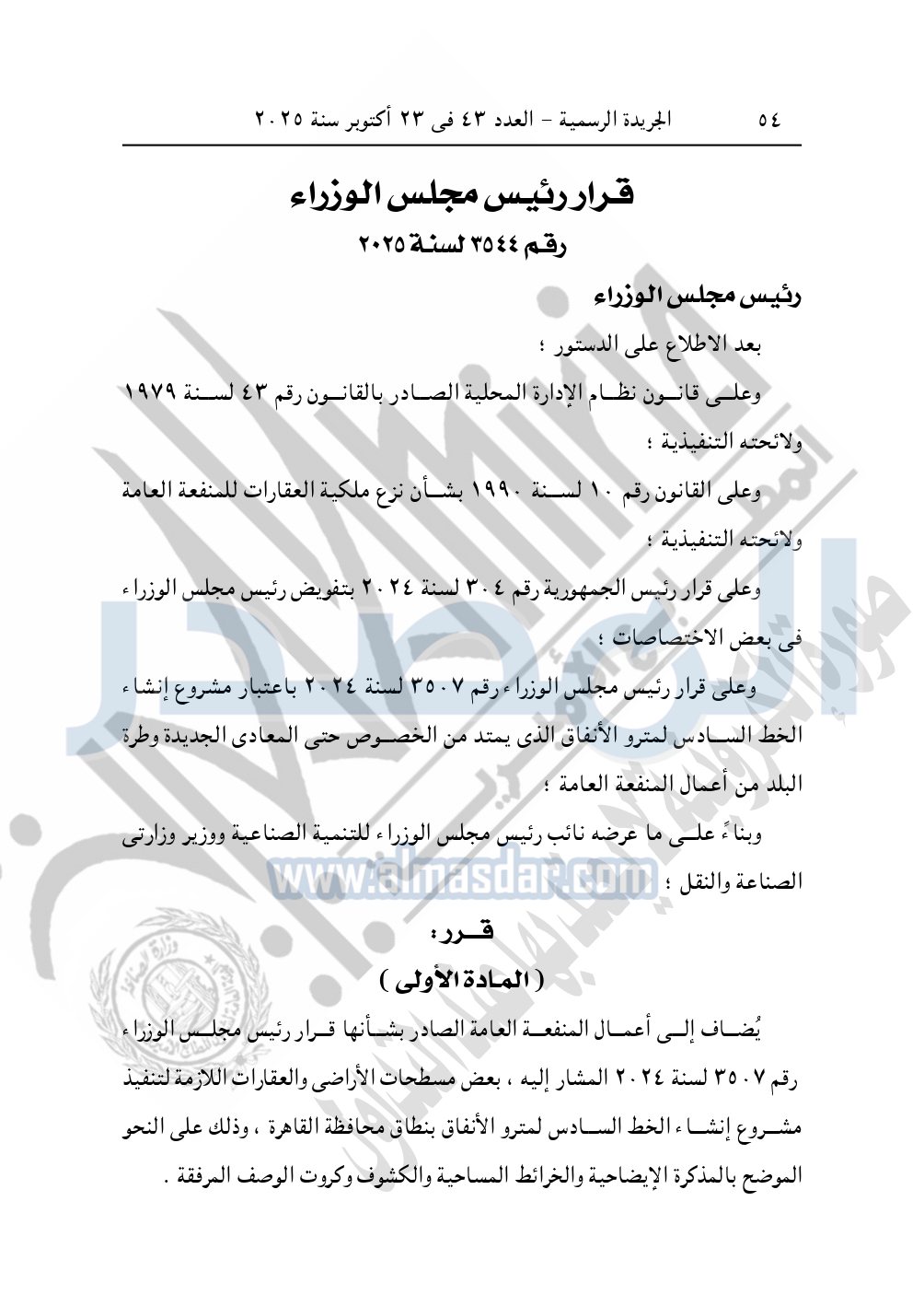 نشرت الجريدة الرسمية في العدد 43، الصادر بتاريخ 23 أكتوبر 2025، قرار رئيس مجلس الوزراء، رقم 2803 لسنة 2025، بشأن نزع ملكية بعض مسطحات الأراضى والعقارات لإقامة مشروع إنشاء الخط السادس لمترو الأنفاق بمحافظة القاهرة.
