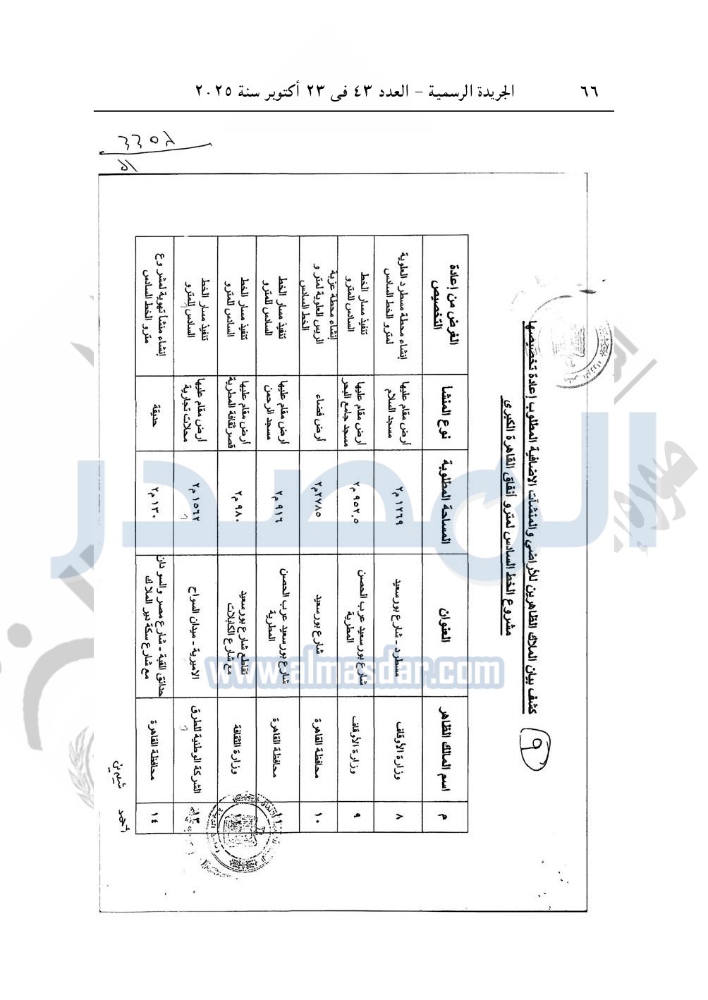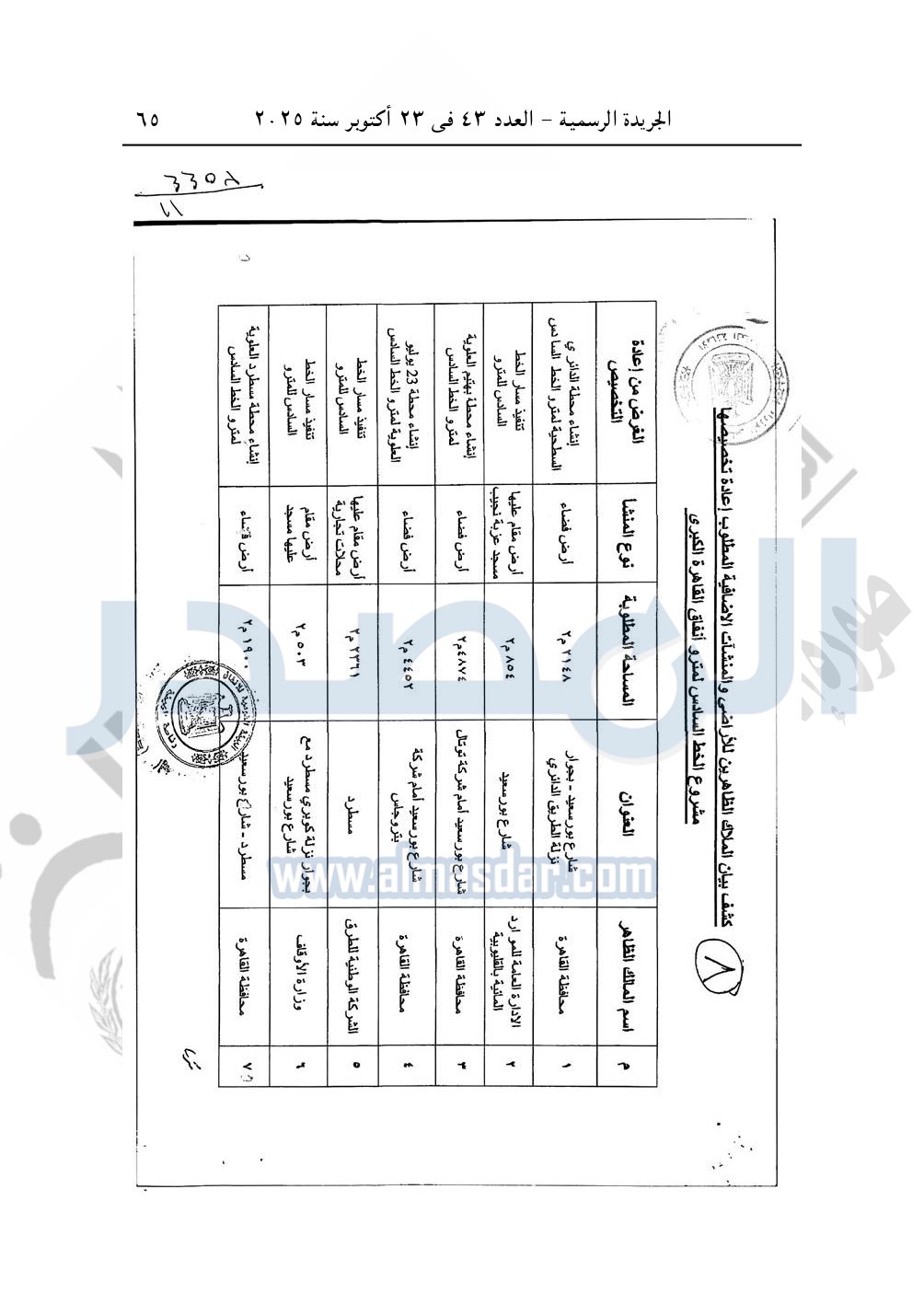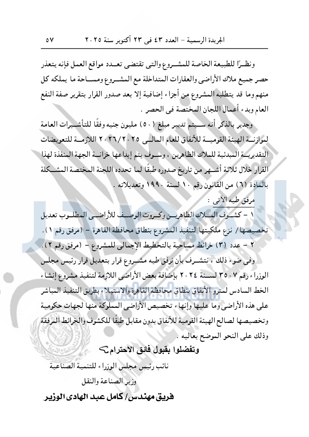 نشرت الجريدة الرسمية في العدد 43، الصادر بتاريخ 23 أكتوبر 2025، قرار رئيس مجلس الوزراء، رقم 2803 لسنة 2025، بشأن نزع ملكية بعض مسطحات الأراضى والعقارات لإقامة مشروع إنشاء الخط السادس لمترو الأنفاق بمحافظة القاهرة.