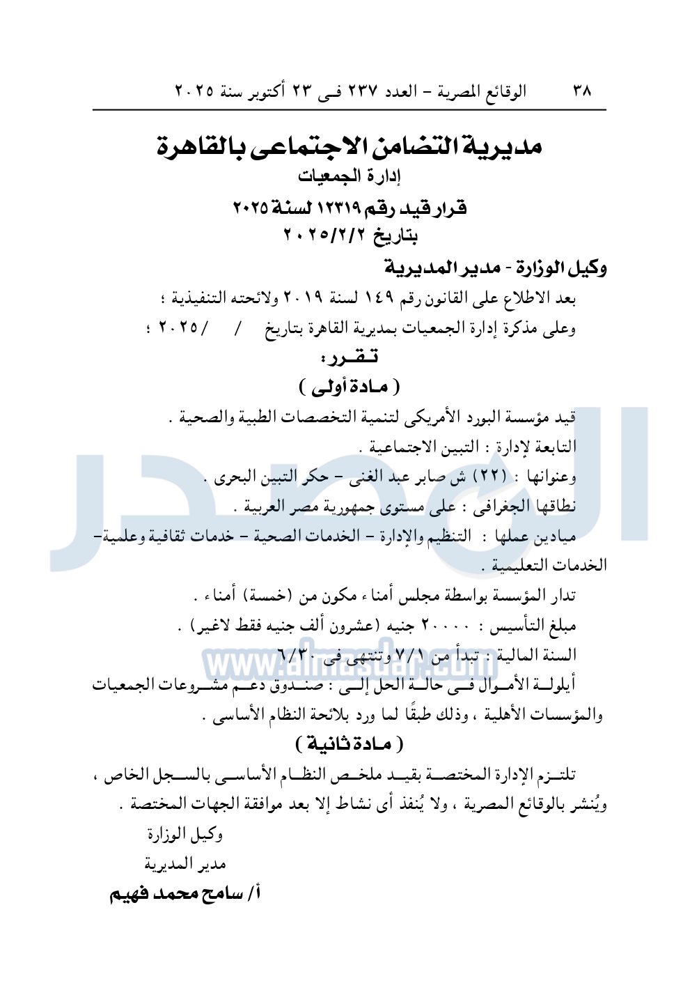 نشرت الوقائع المصرية في العدد 237، بتاريخ 23 أكتوبر 2025، قرار مديرية التضامن الاجتماعي بالقاهرة، قيد رقم 12319 لسنة 2025، بتاريخ 2-2-2025، بشأن قيد مؤسسة البورد الأمريكي لتنمية التخصصات الطبية والصحية.