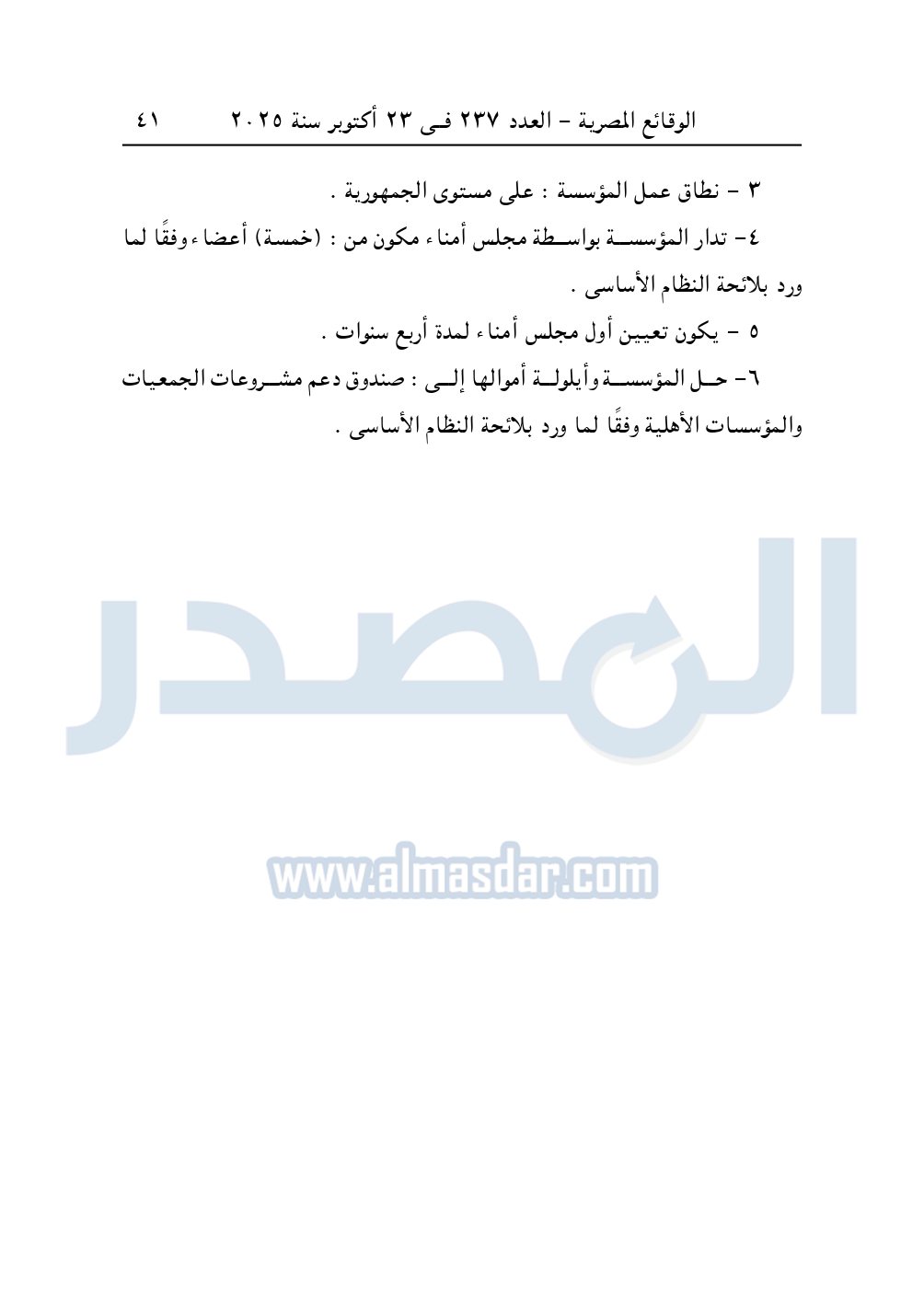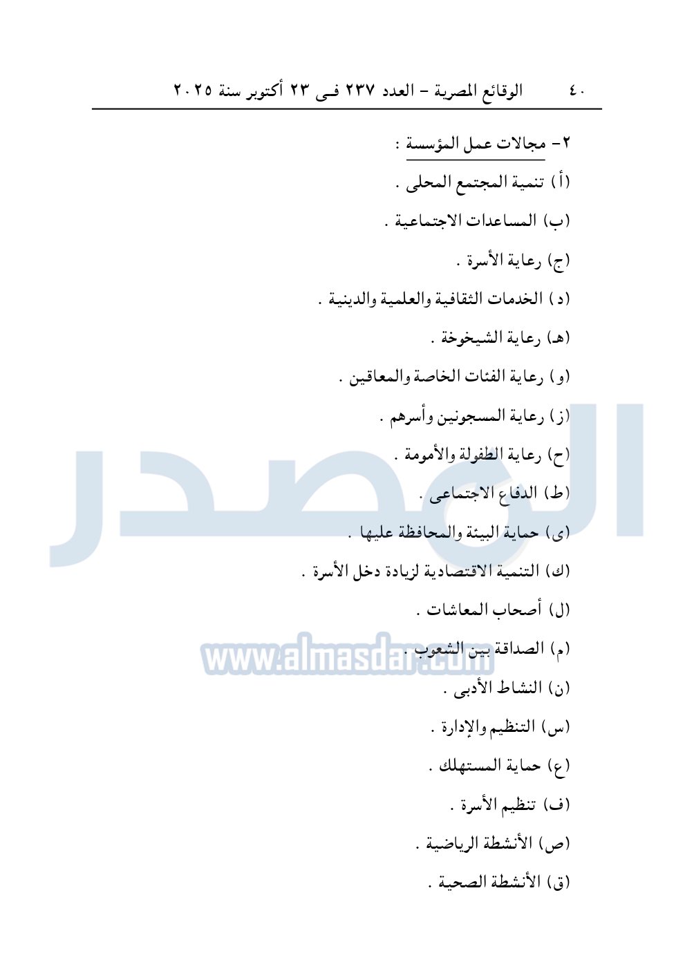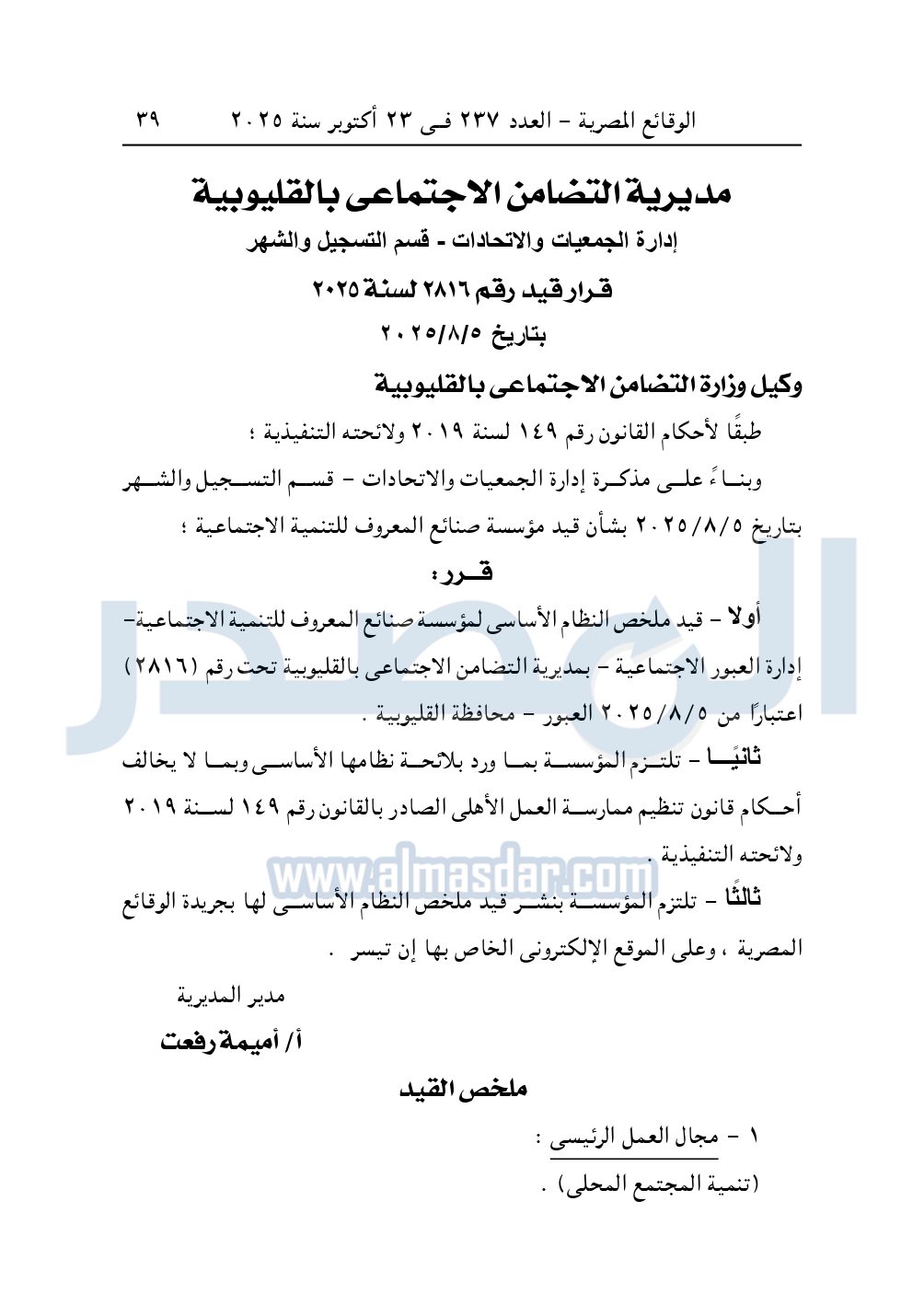 كما نشرت الوقائع المصرية في العدد 237، بتاريخ 23 أكتوبر 2025، قرار مديرية التضامن الاجتماعي بالقليوبية، قيد رقم 2816 لسنة 2025، بتاريخ 5-8-2025، بشأن قيد مؤسسة صانع المعروف للتنمية الاجتماعية.