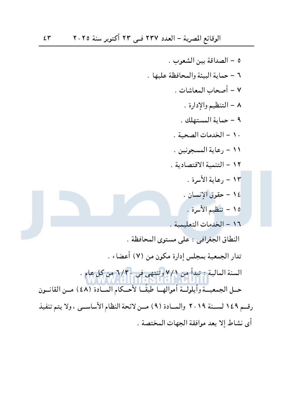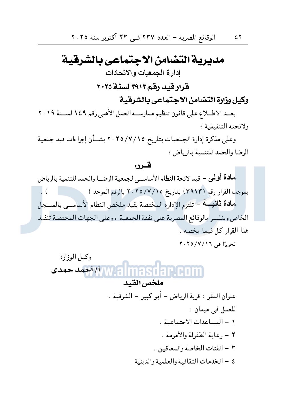 وأيضا نشرت الوقائع المصرية في العدد 237، بتاريخ 23 أكتوبر 2025، قرار مديرية التضامن الاجتماعي بالشرقية، قيد رقم 3913 لسنة 2025، بشأن قيد جمعية الرضا والحمد للتنمية بالرياض.