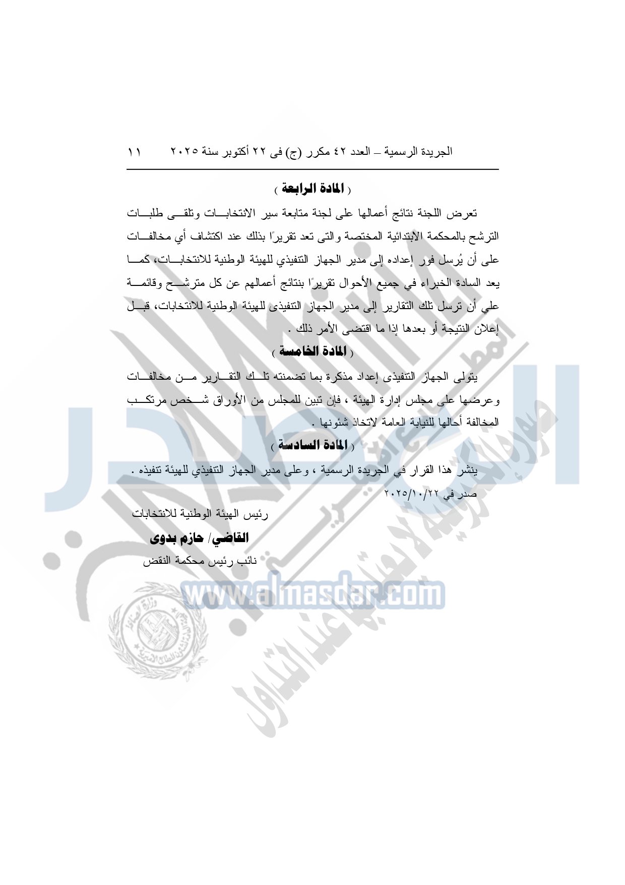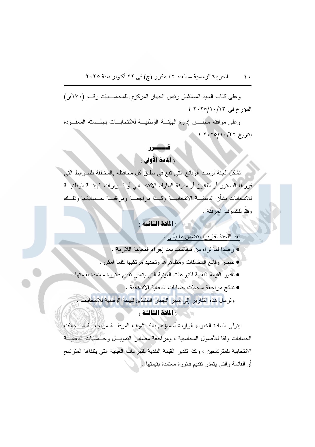 نشرت الجريدة الرسمية في العدد 42 مكرر "ج"، بتاريخ 22 أكتوبر 2025، قرار الهيئة الوطنية للانتخابات، رقم 54 لسنة 2025، بشأن تشكيل ومهام وإجراءات لجنة رصد مخالفات ضوابط الدعاية الانتخابية لانتخابات مجلس النواب.