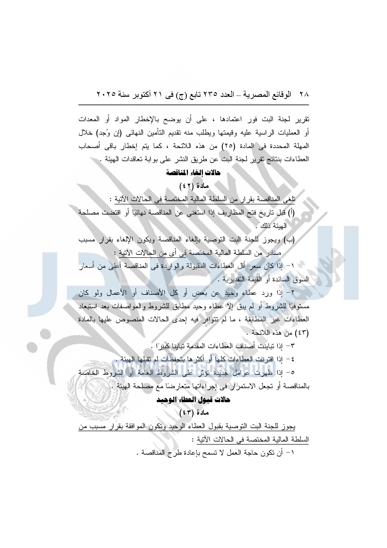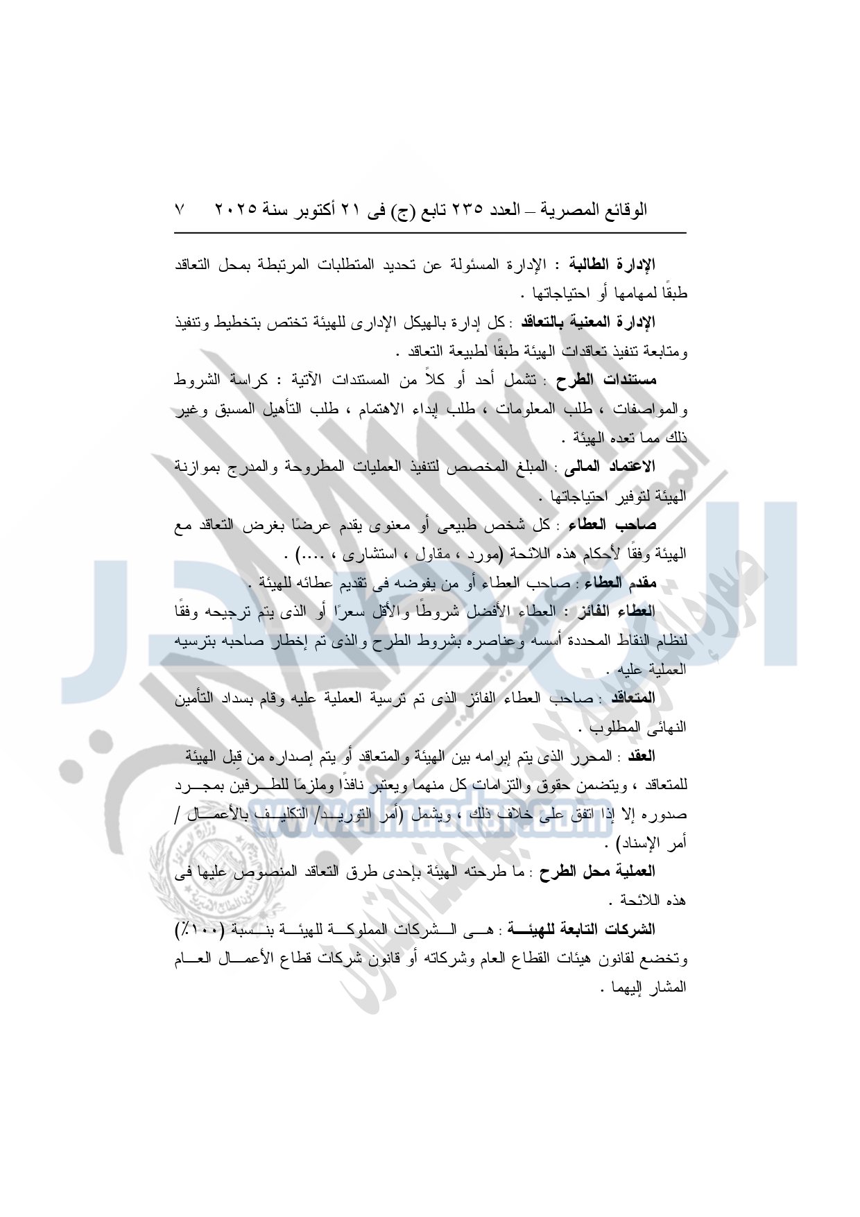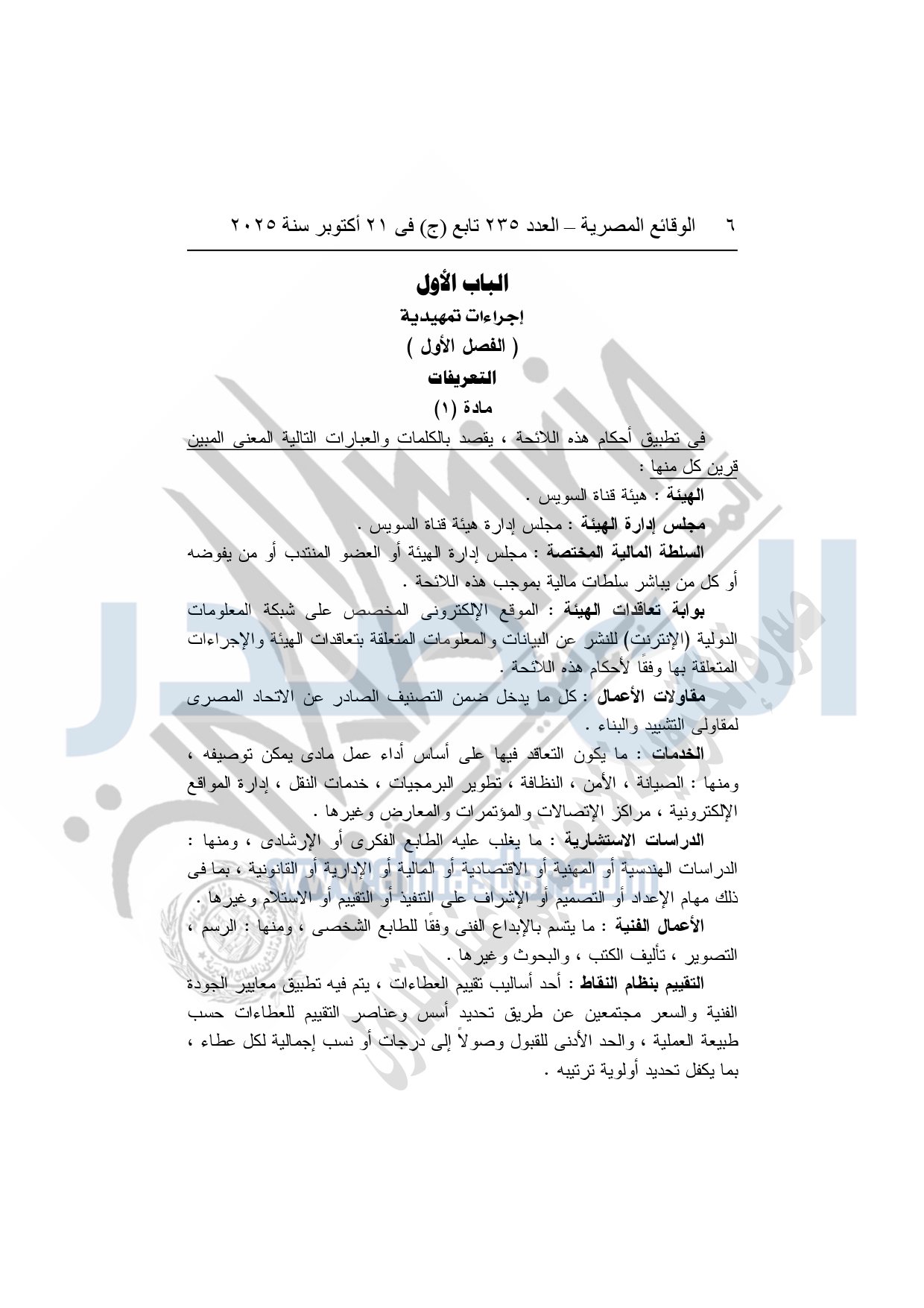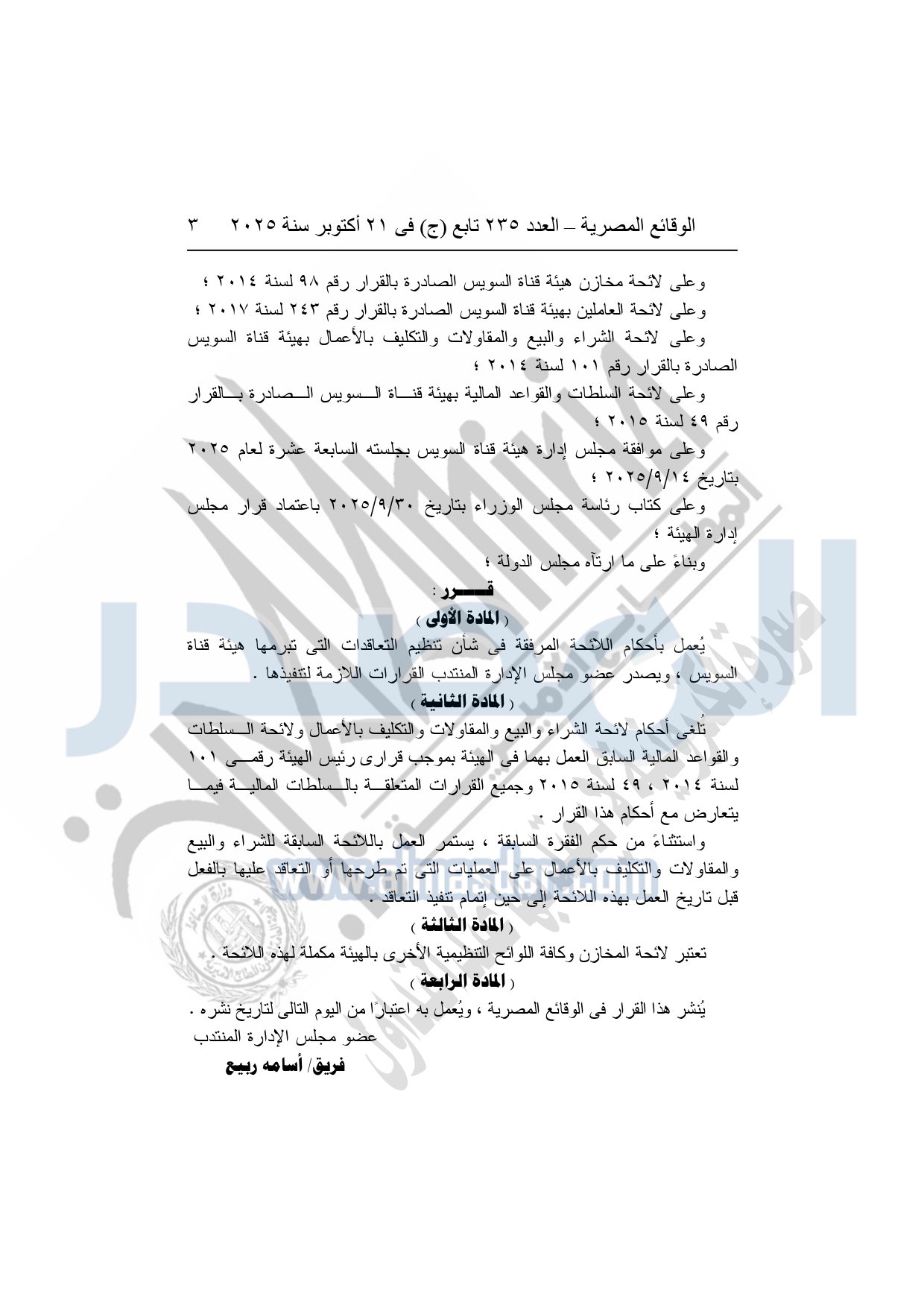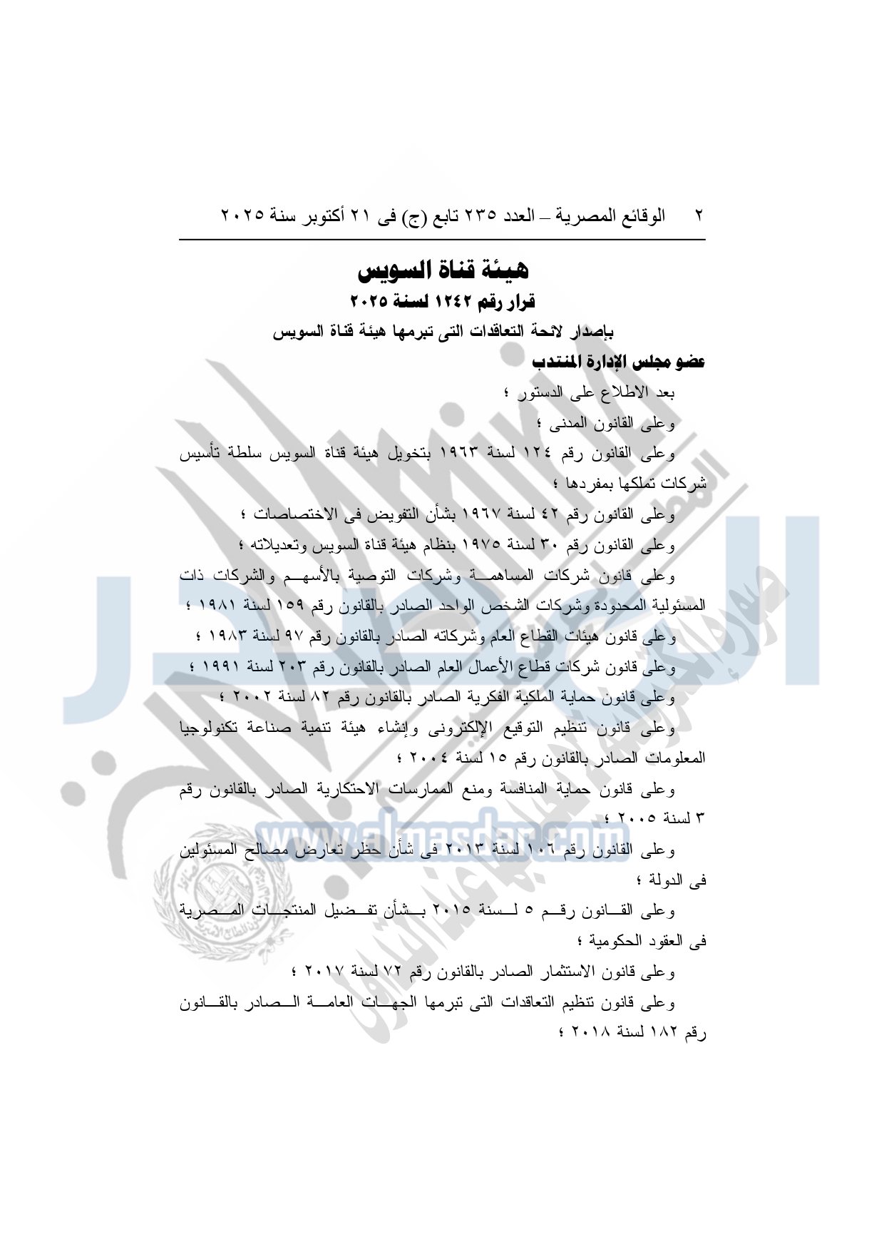 نشرت الوقائع المصرية في العدد 235 تابع "ج"، بتاريخ 21 أكتوبر 2025، قرار هيئة قناة السويس، رقم 1242 لسنة 2025، بشأن إصدار لائحة التعاقدات التي تبرمها هيئة قناة السويس.