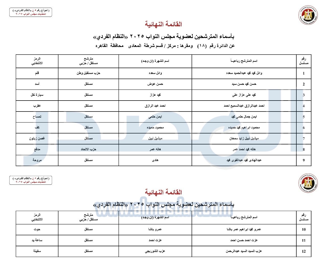 - القائمة النهائية بأسماء المترشحين لعضوية مجلس النواب 2025 “النظام الفردي” عن الدائرة رقم “18” ومقرها مركز / قسم شرطة المعادي محافظة القاهرة.