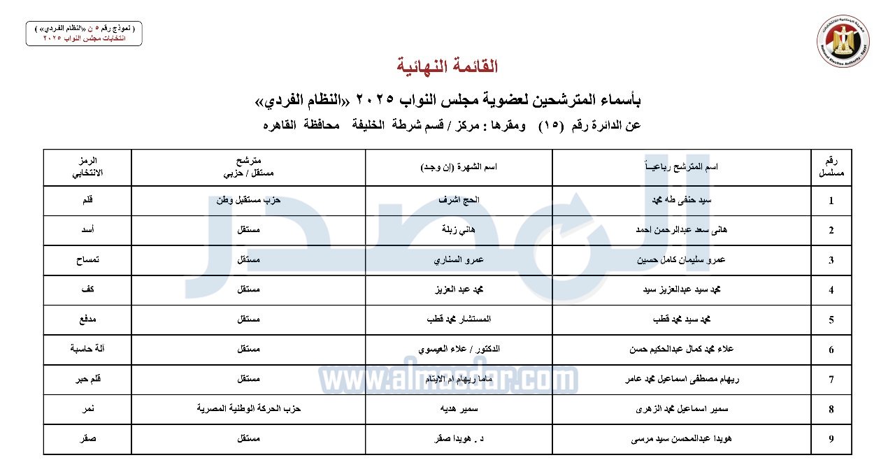 - القائمة النهائية بأسماء المترشحين لعضوية مجلس النواب 2025 “النظام الفردي” عن الدائرة رقم “15” ومقرها مركز / قسم شرطة الخليفة محافظة القاهرة.