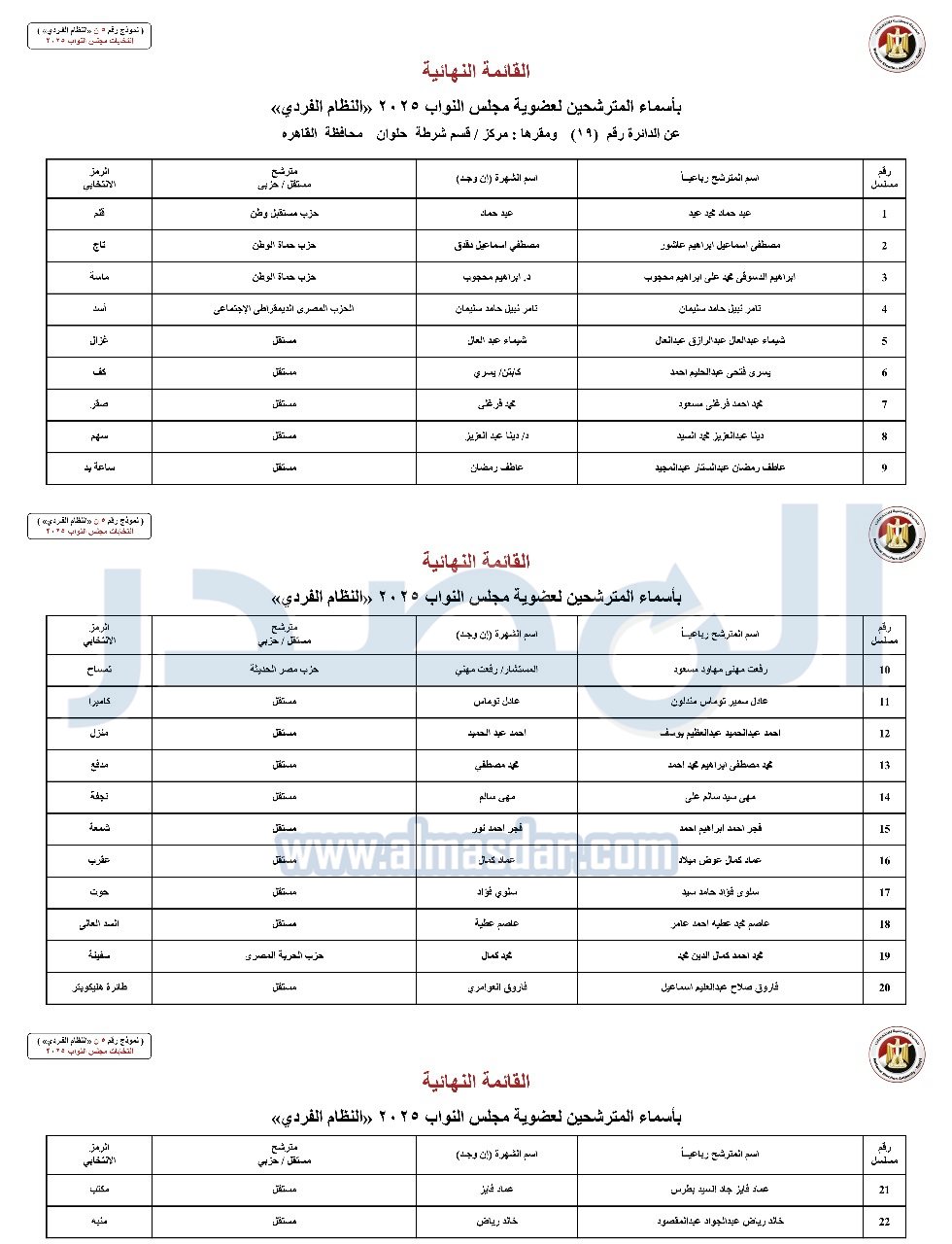 - القائمة النهائية بأسماء المترشحين لعضوية مجلس النواب 2025 “النظام الفردي” عن الدائرة رقم “19” ومقرها مركز / قسم شرطة حلوان محافظة القاهرة.