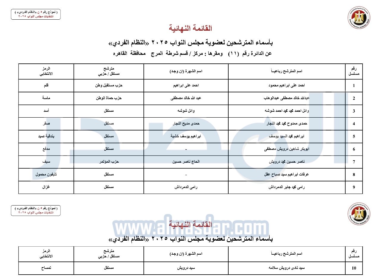- القائمة النهائية بأسماء المترشحين لعضوية مجلس النواب 2025 “النظام الفردي” عن الدائرة رقم “11” ومقرها مركز / قسم شرطة المرج محافظة القاهرة.