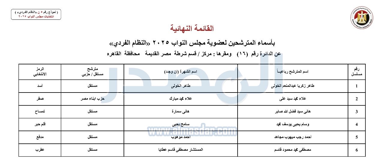 - القائمة النهائية بأسماء المترشحين لعضوية مجلس النواب 2025 “النظام الفردي” عن الدائرة رقم “16” ومقرها مركز / قسم شرطة مصر القديمة محافظة القاهرة.