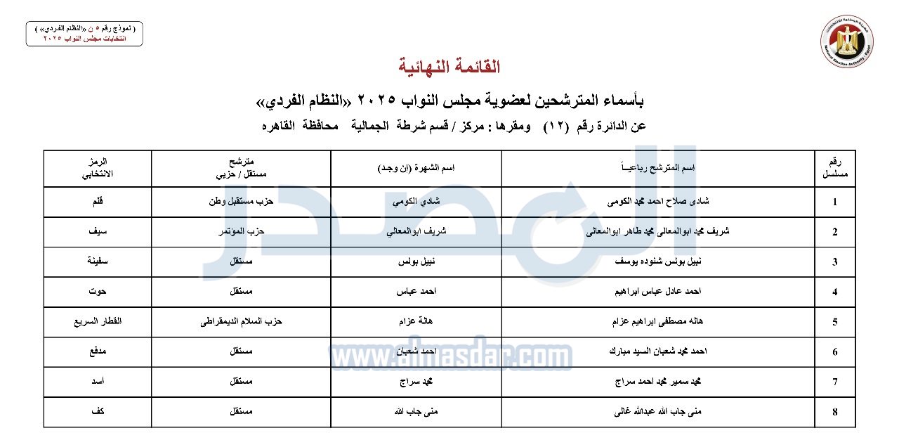 - القائمة النهائية بأسماء المترشحين لعضوية مجلس النواب 2025 “النظام الفردي” عن الدائرة رقم “12” ومقرها مركز / قسم شرطة الجمالية محافظة القاهرة.