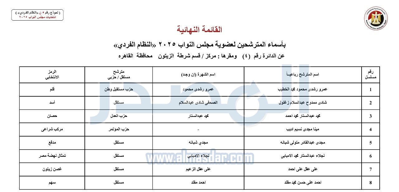 - القائمة النهائية بأسماء المترشحين لعضوية مجلس النواب 2025 “النظام الفردي” عن الدائرة رقم “4” ومقرها مركز / قسم شرطة الزيتون محافظة القاهرة.