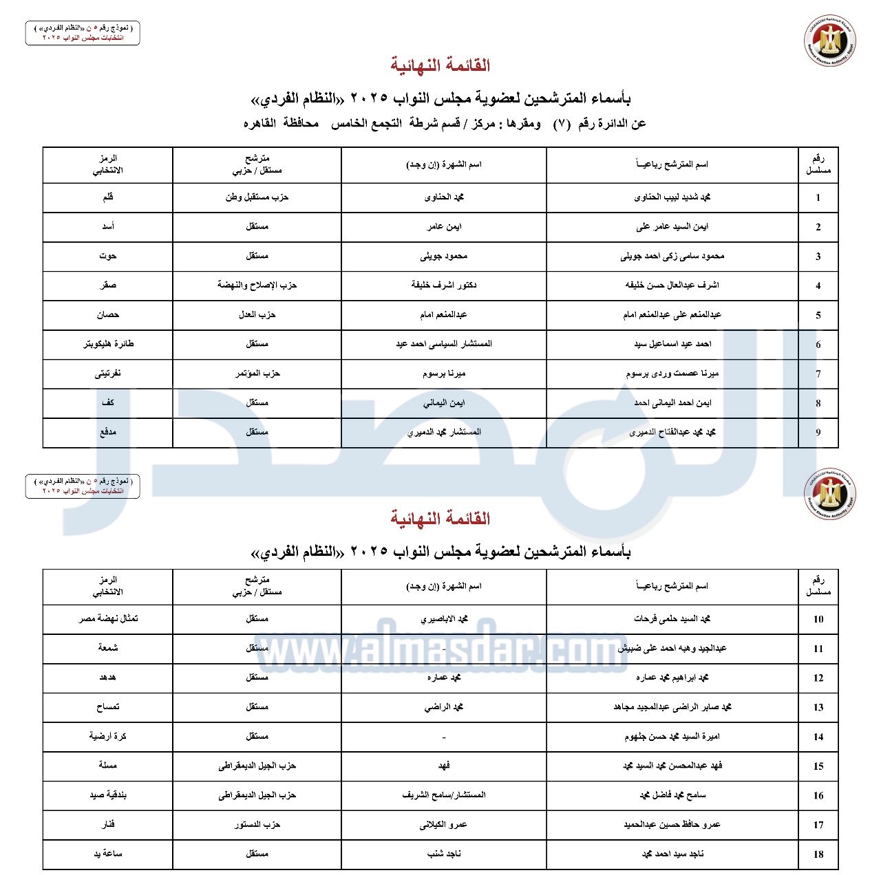 - القائمة النهائية بأسماء المترشحين لعضوية مجلس النواب 2025 “النظام الفردي” عن الدائرة رقم “7” ومقرها مركز / قسم شرطة التجمع الخامس محافظة القاهرة.