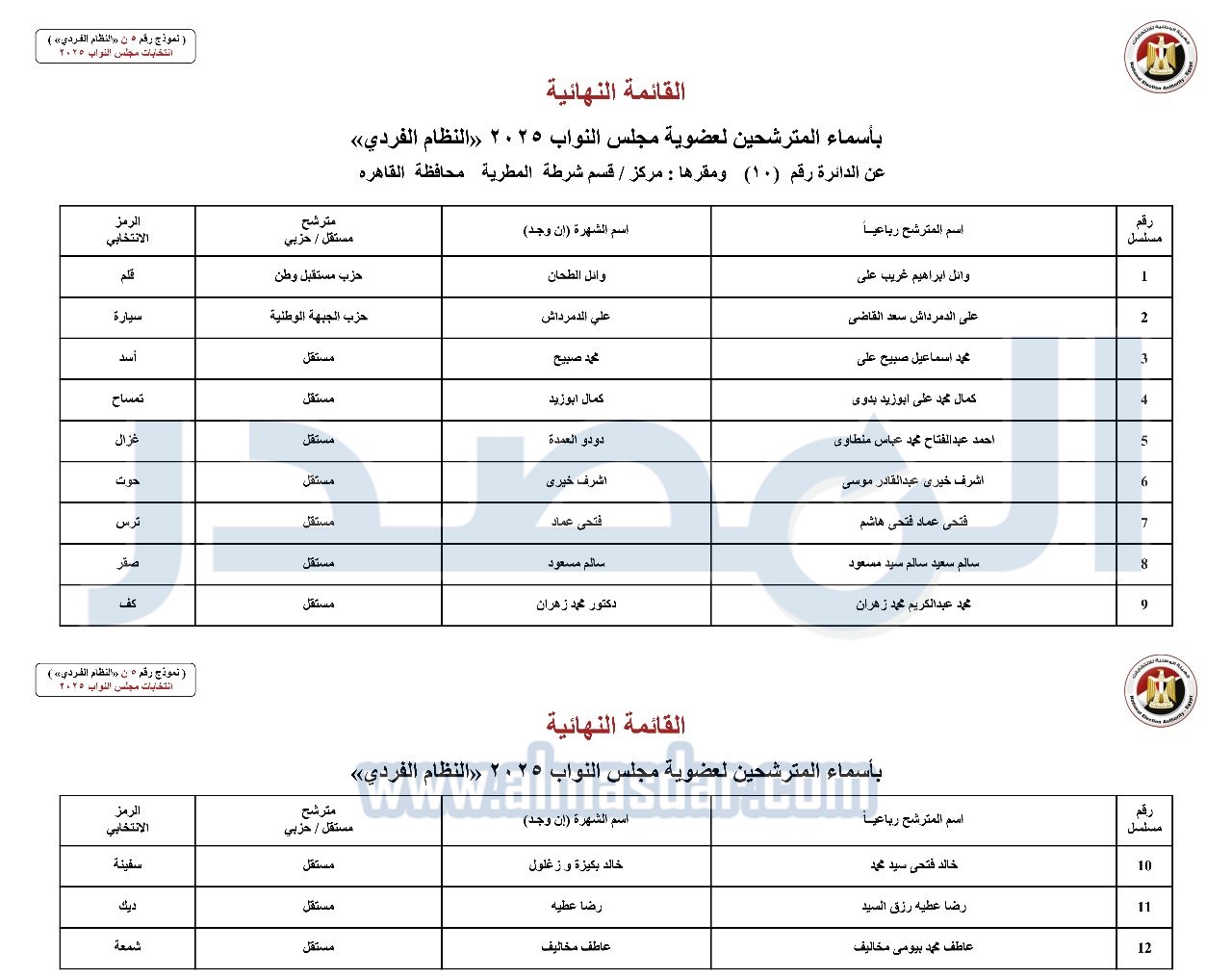 - القائمة النهائية بأسماء المترشحين لعضوية مجلس النواب 2025 “النظام الفردي” عن الدائرة رقم “10” ومقرها مركز / قسم شرطة المطرية محافظة القاهرة.