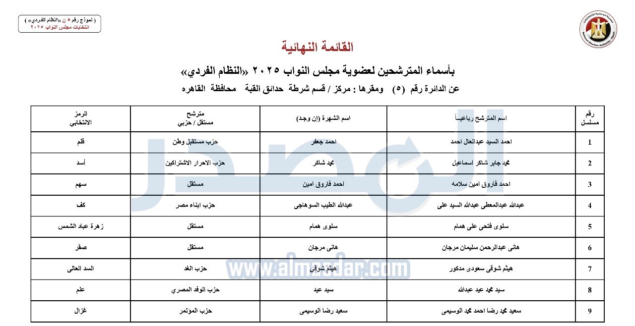 - القائمة النهائية بأسماء المترشحين لعضوية مجلس النواب 2025 “النظام الفردي” عن الدائرة رقم “5” ومقرها مركز / قسم شرطة حدائق القبة محافظة القاهرة.