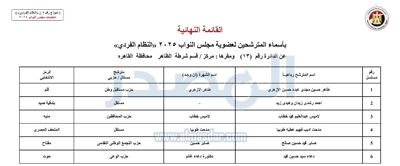 - القائمة النهائية بأسماء المترشحين لعضوية مجلس النواب 2025 “النظام الفردي” عن الدائرة رقم “13” ومقرها مركز / قسم شرطة الظاهر محافظة القاهرة.