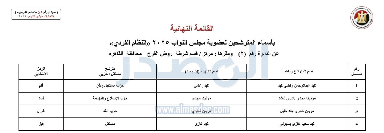 - القائمة النهائية بأسماء المترشحين لعضوية مجلس النواب 2025 “النظام الفردي” عن الدائرة رقم “2” ومقرها مركز / قسم شرطة روض الفرج محافظة القاهرة.
