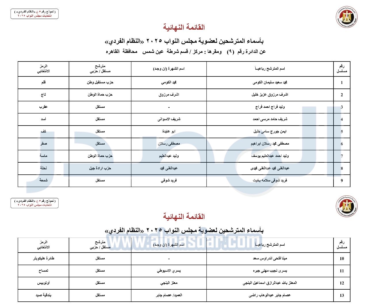 - القائمة النهائية بأسماء المترشحين لعضوية مجلس النواب 2025 “النظام الفردي” عن الدائرة رقم “9” ومقرها مركز / قسم شرطة عين شمس محافظة القاهرة.