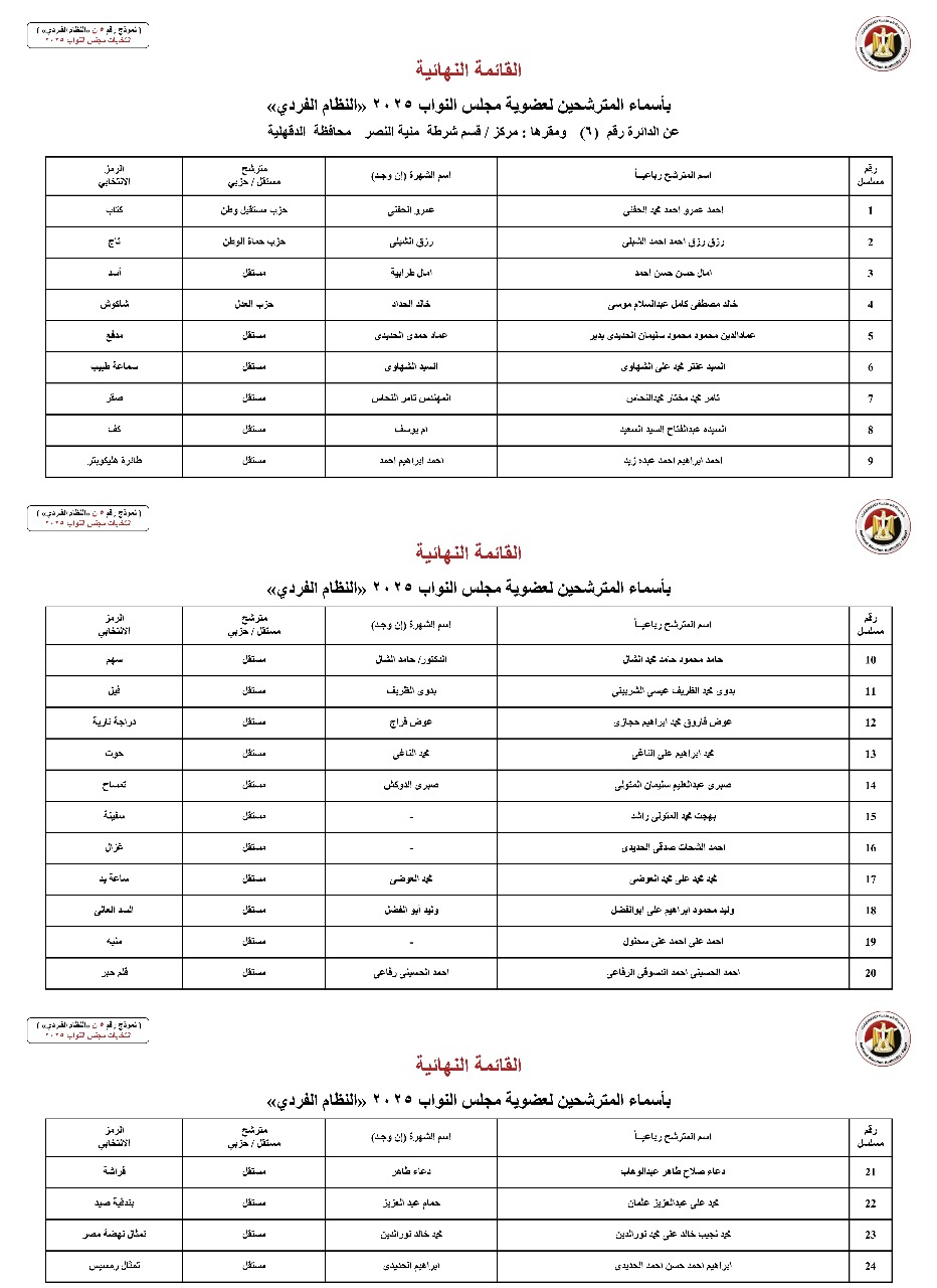 - القائمة النهائية بأسماء المرشحين لعضوية مجلس النواب 2025 “النظام الفردي” عن الدائرة رقم “6” ومقرها مركز / قسم شرطة منية النصر محافظة الدقهلية.