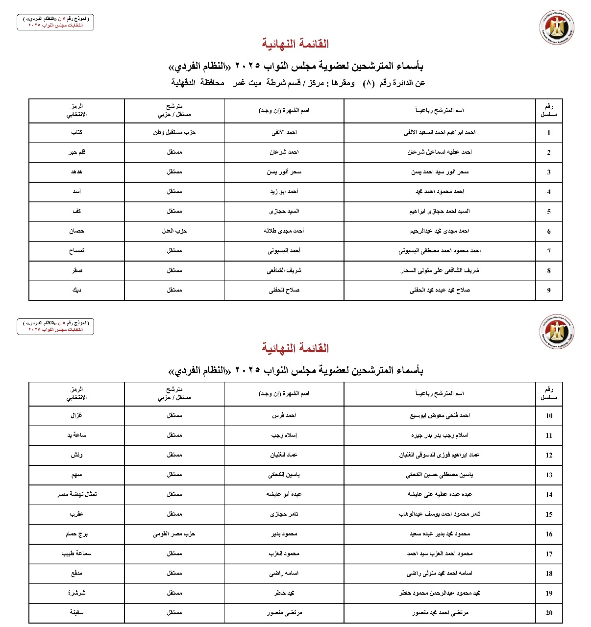 - القائمة النهائية بأسماء المترشحين لعضوية مجلس النواب 2025 “النظام الفردي” عن الدائرة رقم “8” ومقرها مركز / قسم شرطة ميت غمر محافظة الدقهلية.