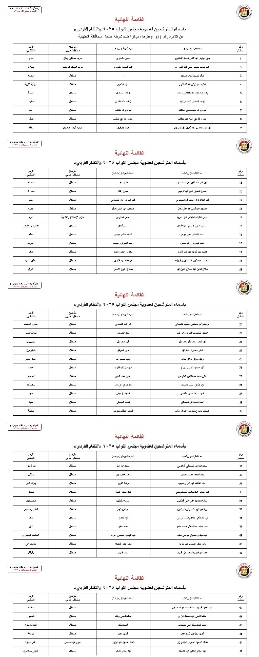- القائمة النهائية بأسماء المترشحين لعضوية مجلس النواب 2025 “النظام الفردي” عن الدائرة رقم “5” ومقرها مركز / قسم شرطة طلخا محافظة الدقهلية.