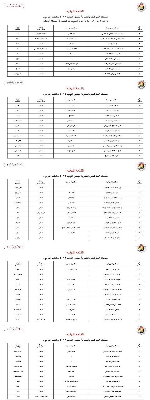 - القائمة النهائية بأسماء المترشحين لعضوية مجلس النواب 2025 “النظام الفردي” عن الدائرة رقم “5” ومقرها مركز / قسم شرطة تكرنس محافظة الدقهلية.
