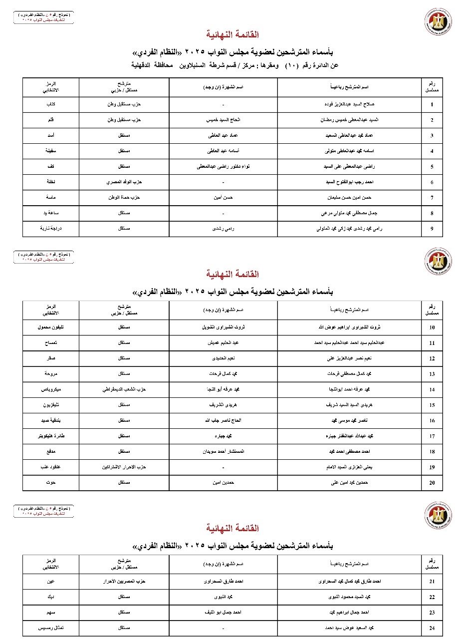 - القائمة النهائية بأسماء المترشحين لعضوية مجلس النواب 2025 “النظام الفردي” عن الدائرة رقم “10” ومقرها مركز / قسم شرطة السنبلاوين محافظة الدقهلية.