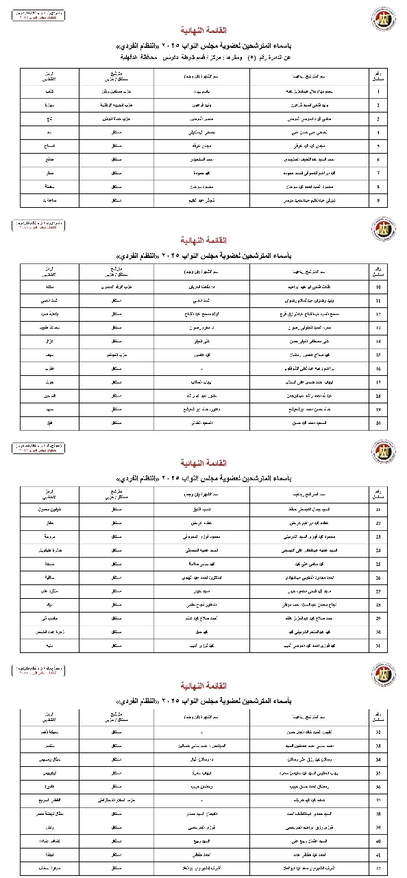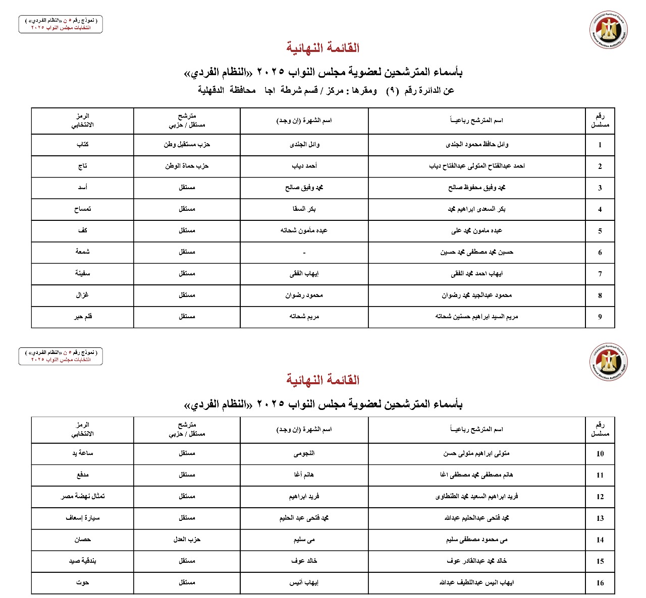 - القائمة النهائية بأسماء المترشحين لعضوية مجلس النواب 2025 “النظام الفردي” عن الدائرة رقم “9” ومقرها مركز / قسم شرطة اجا محافظة الدقهلية.