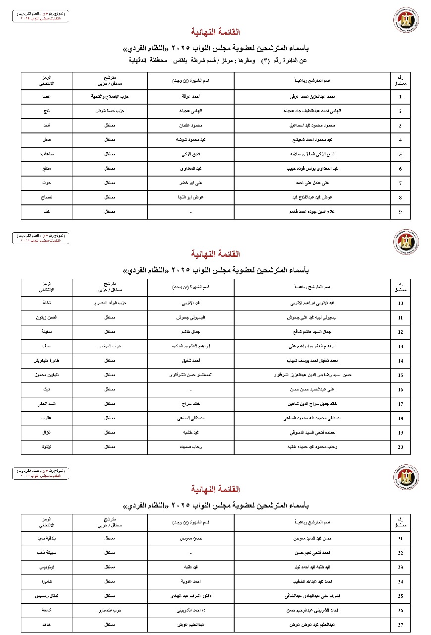 - القائمة النهائية بأسماء المترشحين لعضوية مجلس النواب 2025 “النظام الفردي” عن الدائرة رقم “3” ومقرها مركز / قسم شرطة بلقاس محافظة الدقهلية.