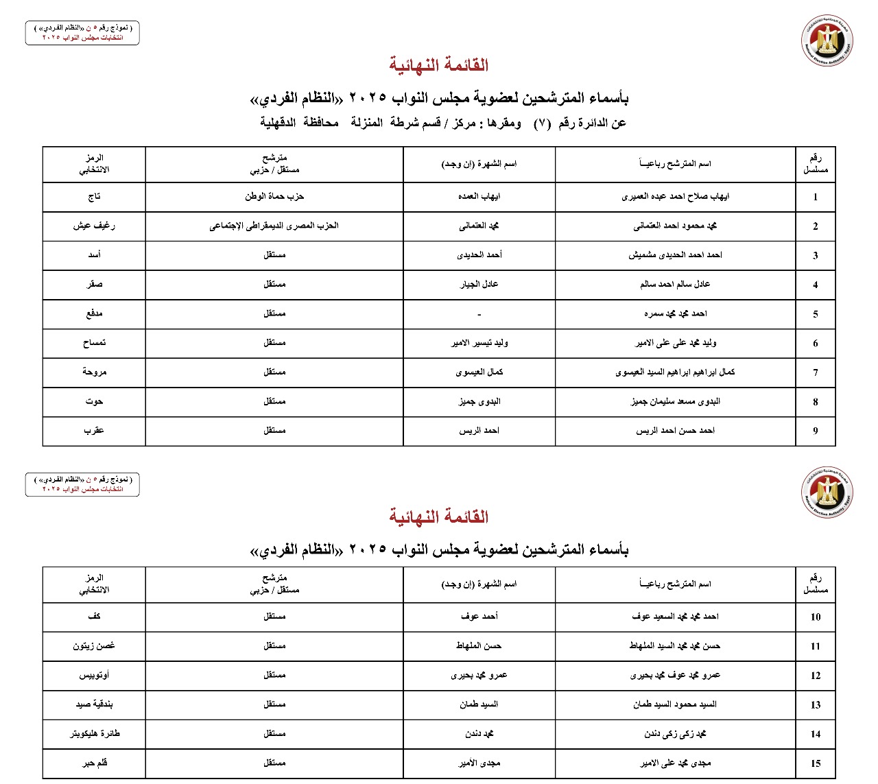 - القائمة النهائية بأسماء المترشحين لعضوية مجلس النواب 2025 “النظام الفردي” عن الدائرة رقم “7” ومقرها مركز / قسم شرطة المنزلة محافظة الدقهلية.