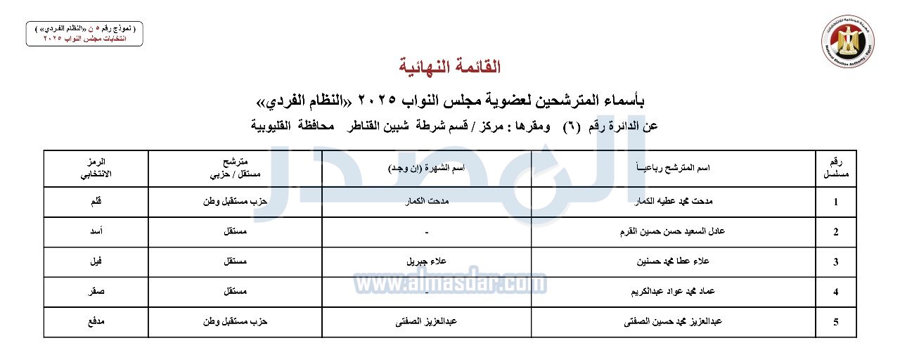 - القائمة النهائية بأسماء المترشحين لعضوية مجلس النواب 2025 "النظام الفردي" عن الدائرة رقم "6" ومقرها: مركز – قسم شرطة شبين القناطر – محافظة القليوبية.