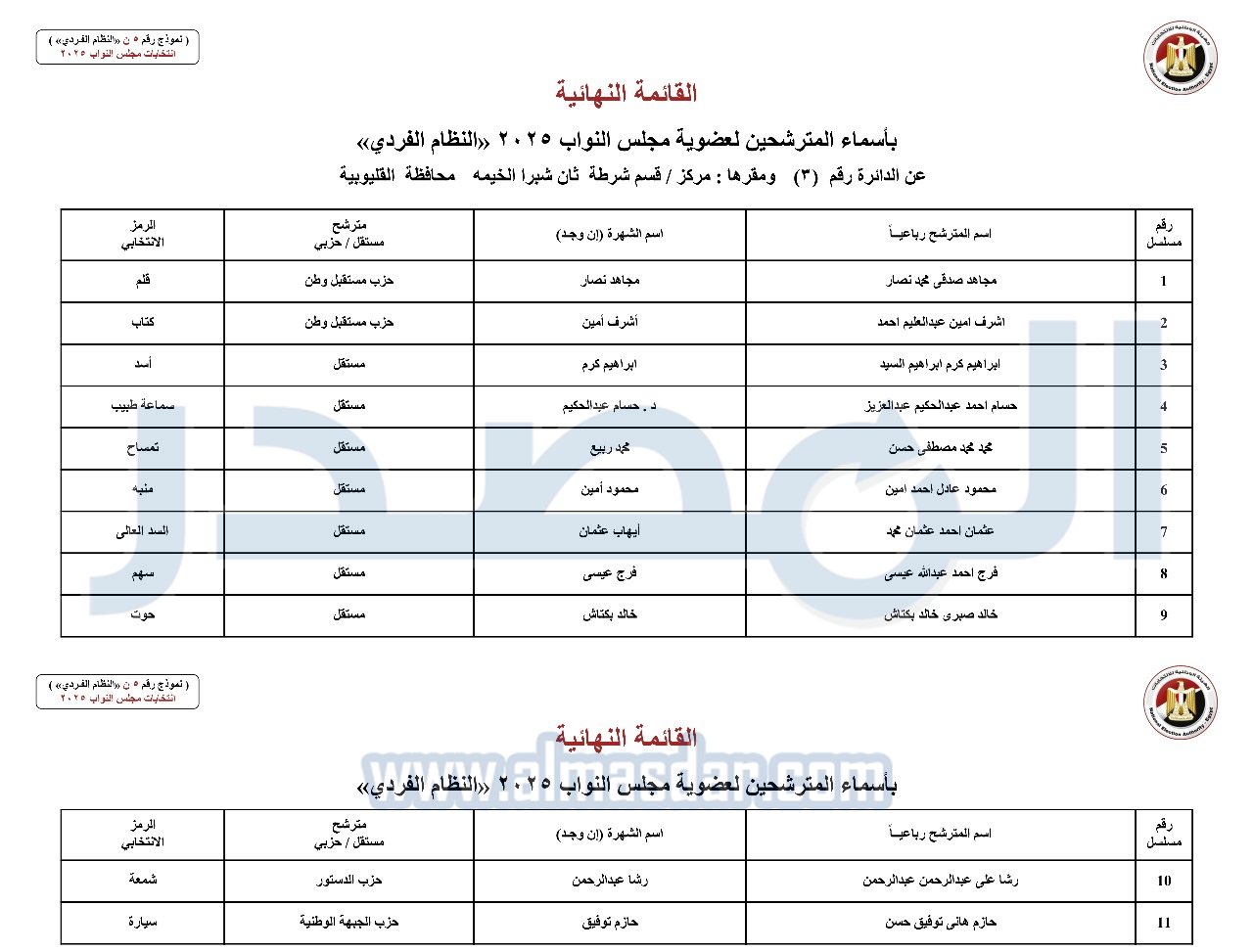 - القائمة النهائية بأسماء المترشحين لعضوية مجلس النواب 2025 "النظام الفردي" عن الدائرة رقم "4" ومقرها: مركز – قسم قليوب – محافظة القليوبية.