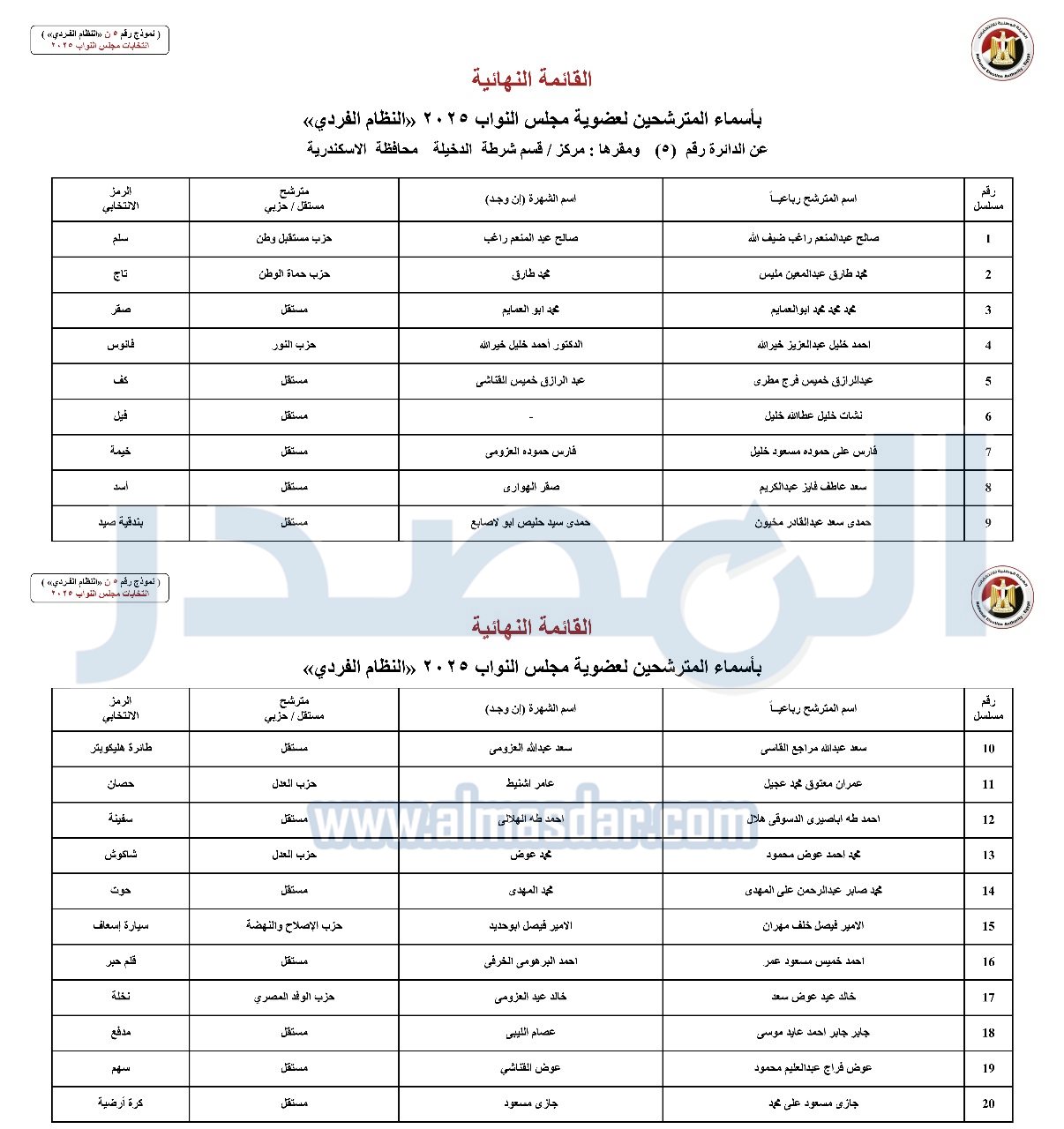 القائمة النهائية بأسماء المرشحين لعضوية مجلس النواب 2025 “النظام الفردي” عن الدائرة رقم “5” ومقرها مركز / قسم شرطة الدخيلة محافظة الإسكندرية.