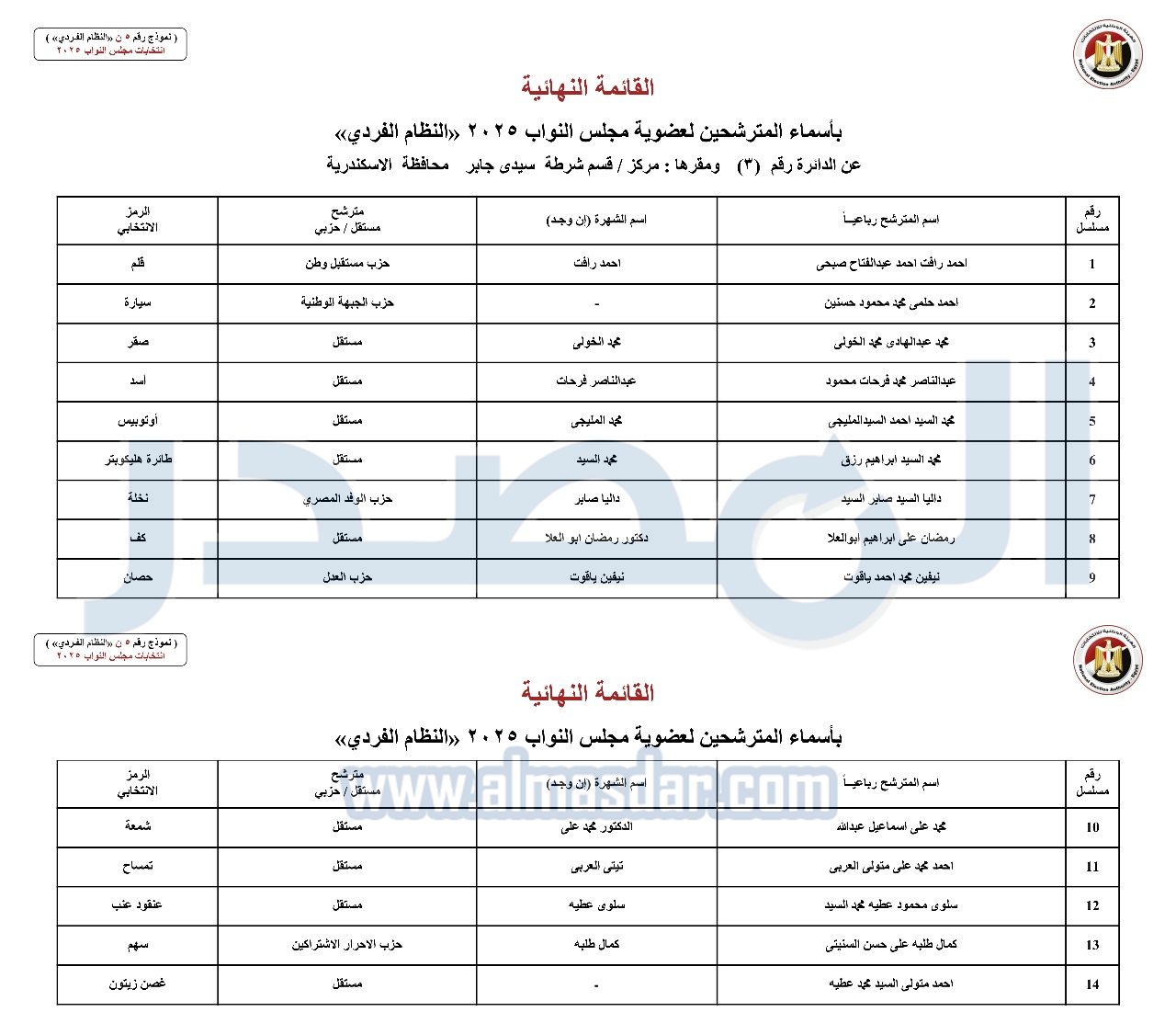 القائمة النهائية بأسماء المرشحين لعضوية مجلس النواب 2025 “النظام الفردي” عن الدائرة رقم “3” ومقرها مركز / قسم شرطة سيدي جابر محافظة الإسكندرية.