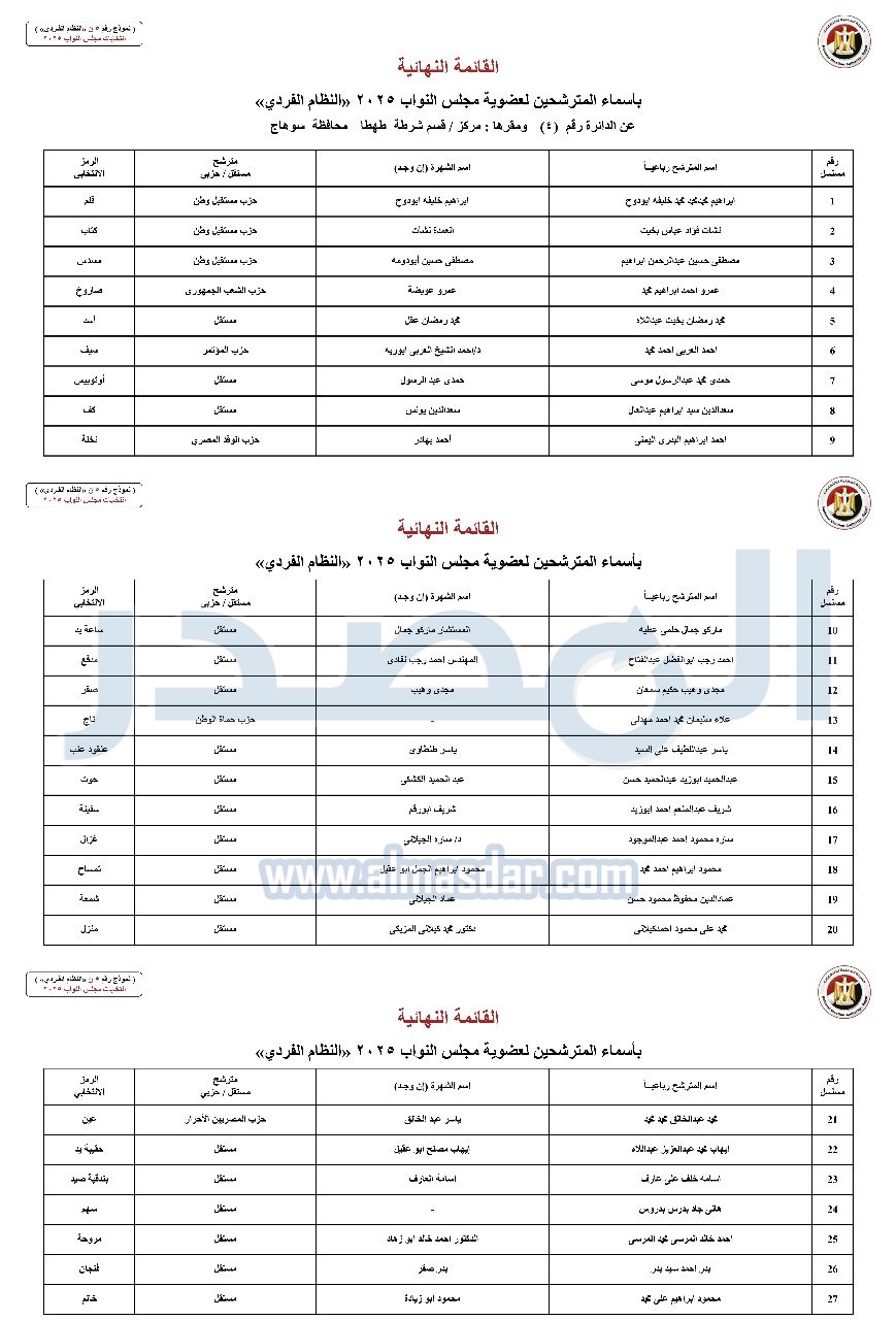 - القائمة النهائية بأسماء المترشحين لعضوية مجلس النواب 2025 "النظام الفردي" عن الدائرة رقم "4" ومقرها: مركز – قسم شرطة طهنطا – محافظة سوهاج.